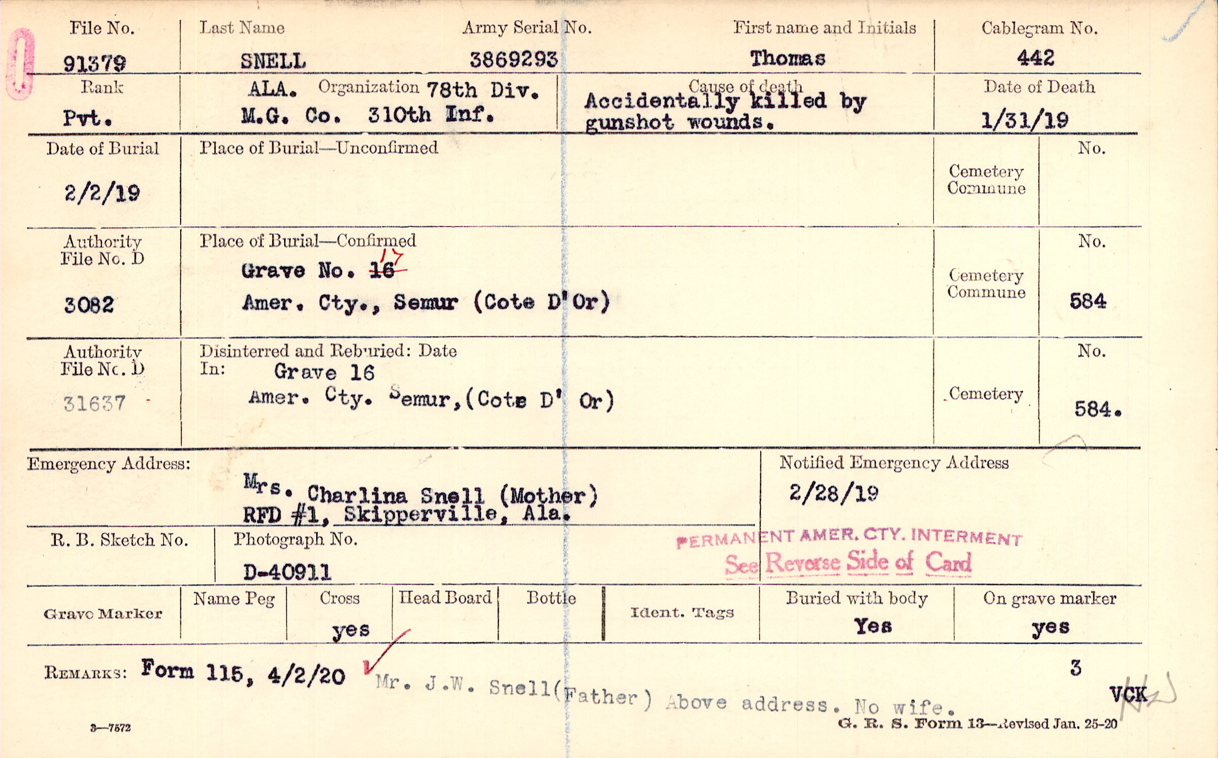 Mr. J.W. Snell (Father) Above address. No wife., 4/2/1920