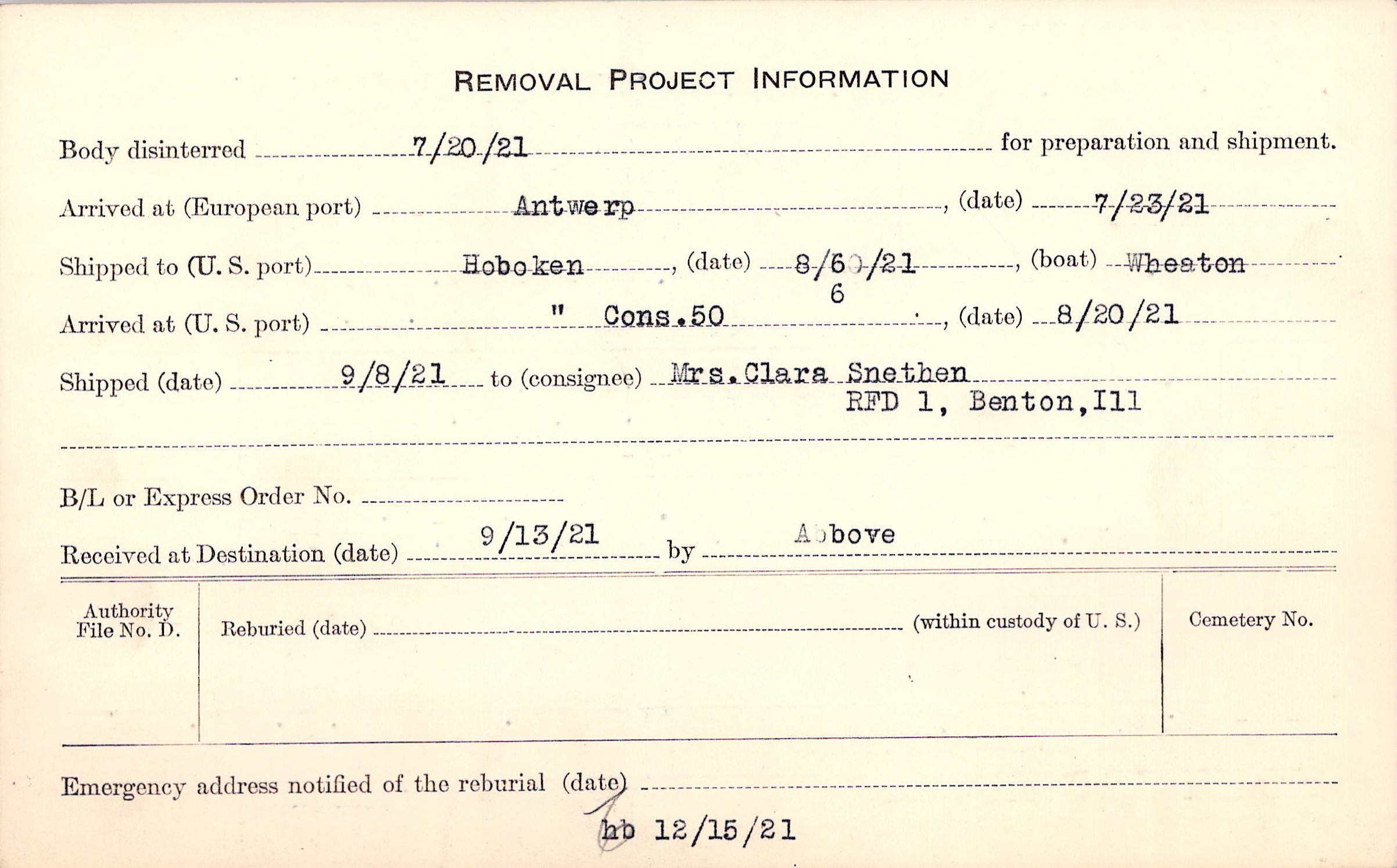 Mrs. Clara Snethen, (Wife), Route #1, Benton, Ill.
