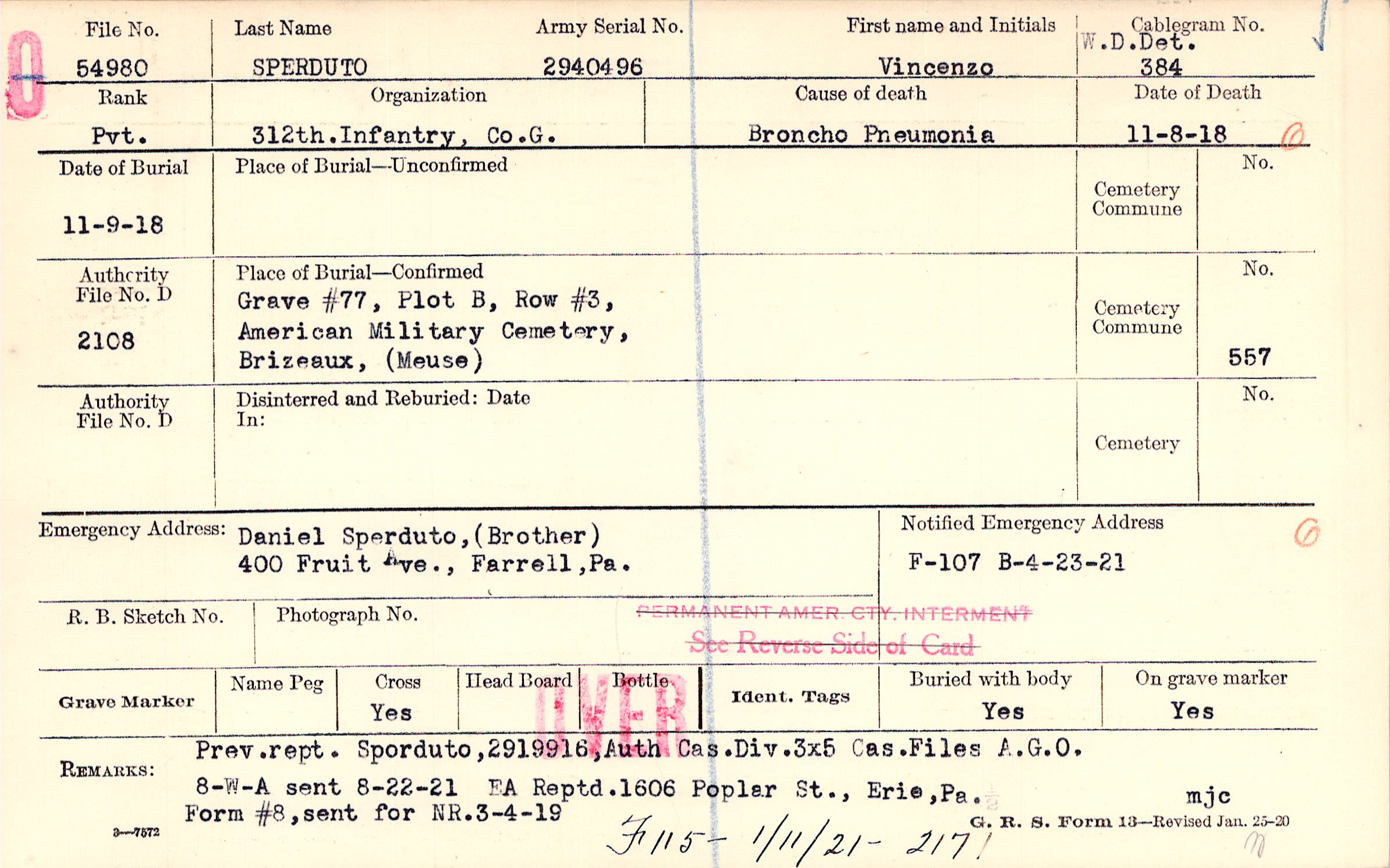 Daniel Sperduto, (Brother), 400 Fruit Ave., Farrell, Pa.