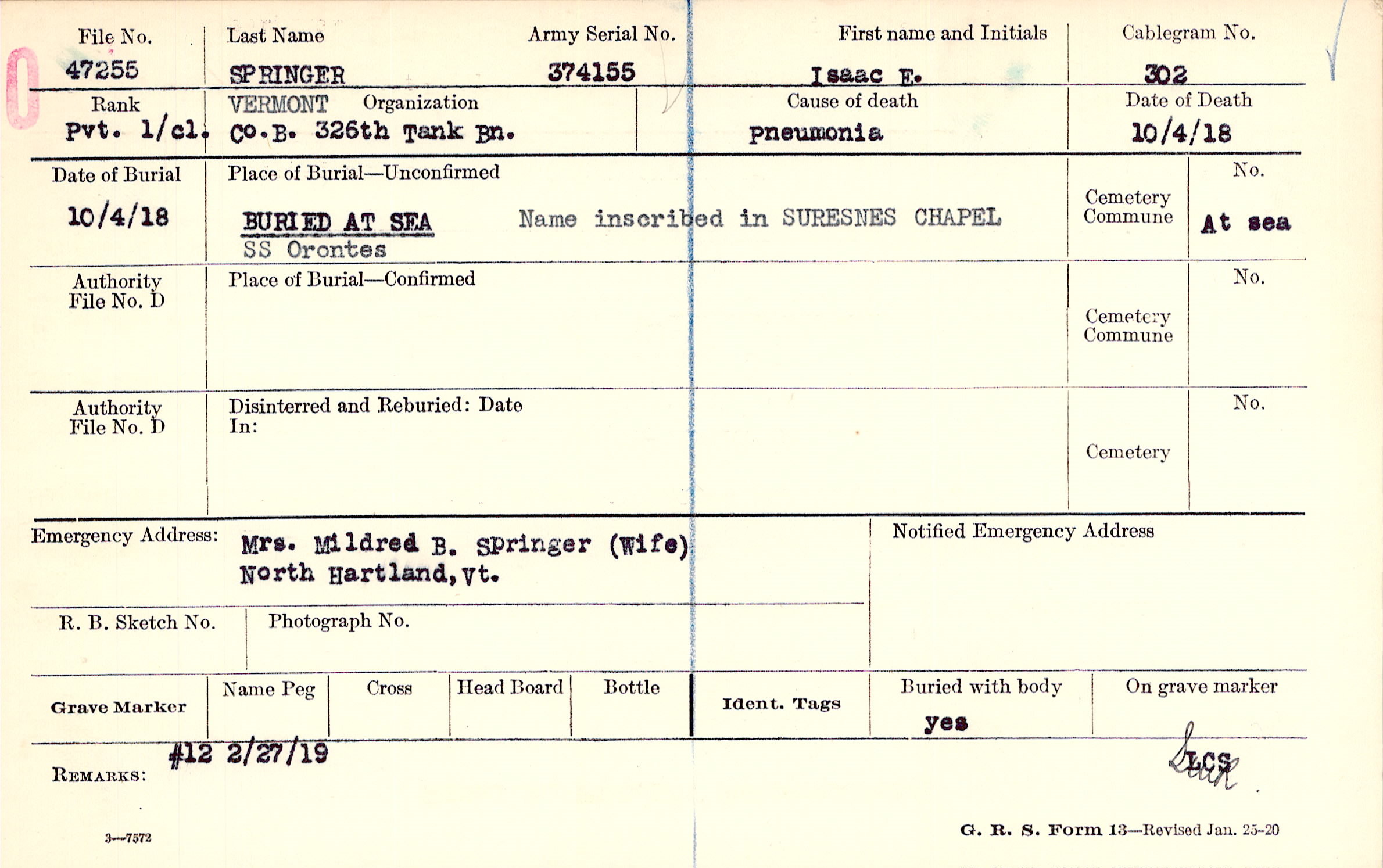 Mrs. Mildred B. Springer (Wife), North Hartland, Vt.