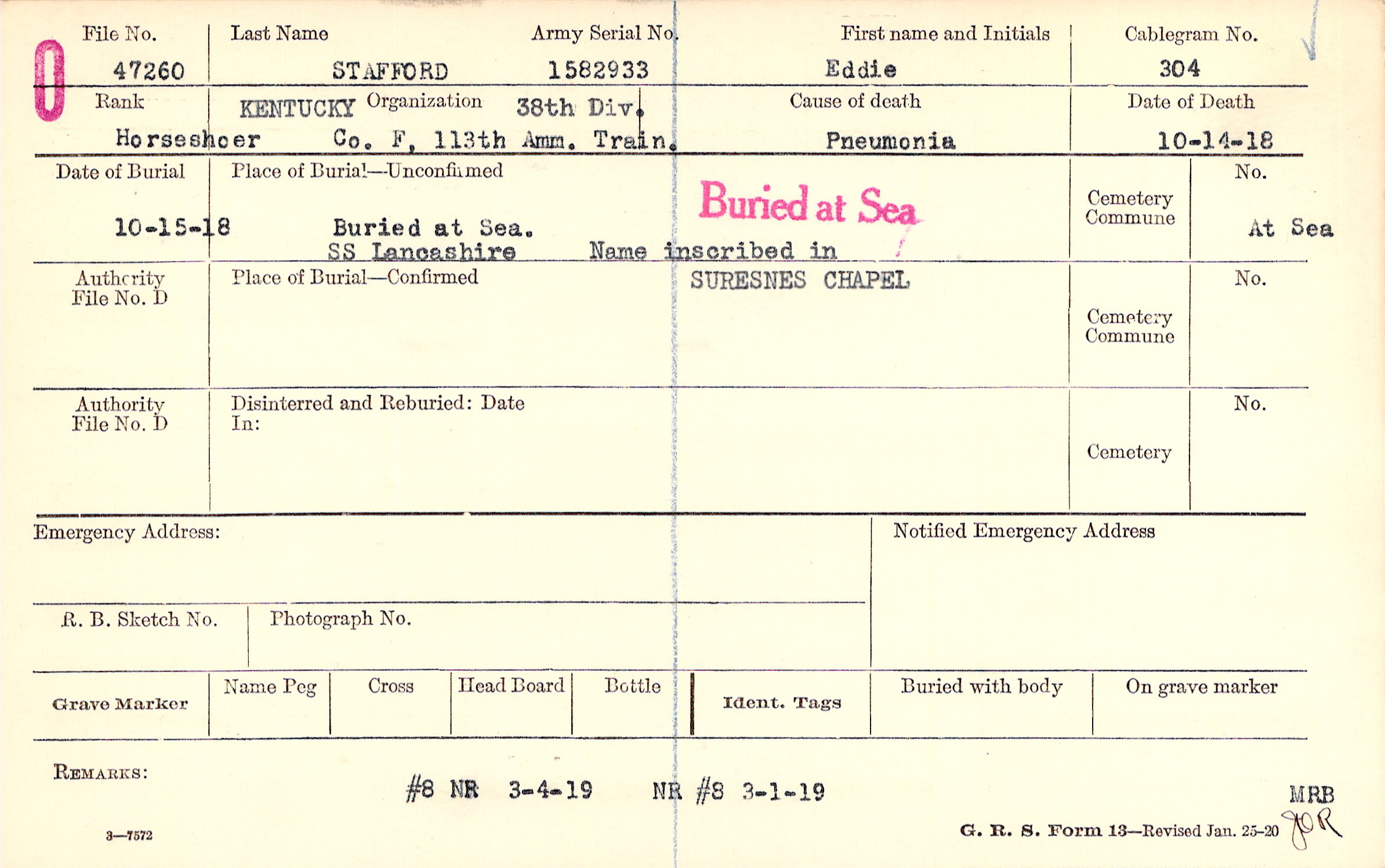 Buried at Sea., SS Lancashire, Name inscribed in SURESNES CHAPEL
