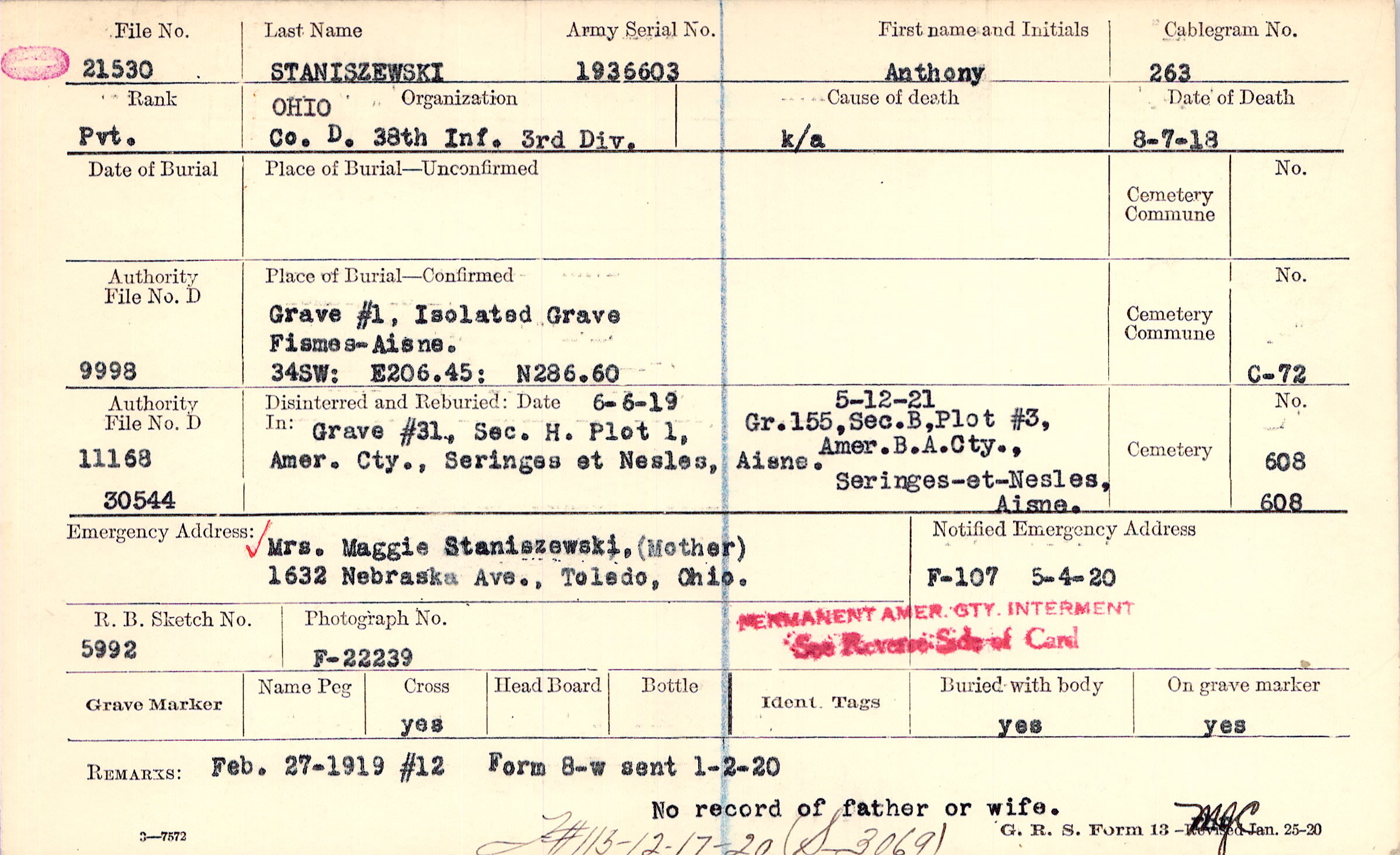 Mrs. Maggie Staniszewski, (Mother), 1632 Nebraska Ave., Toledo, Ohio.