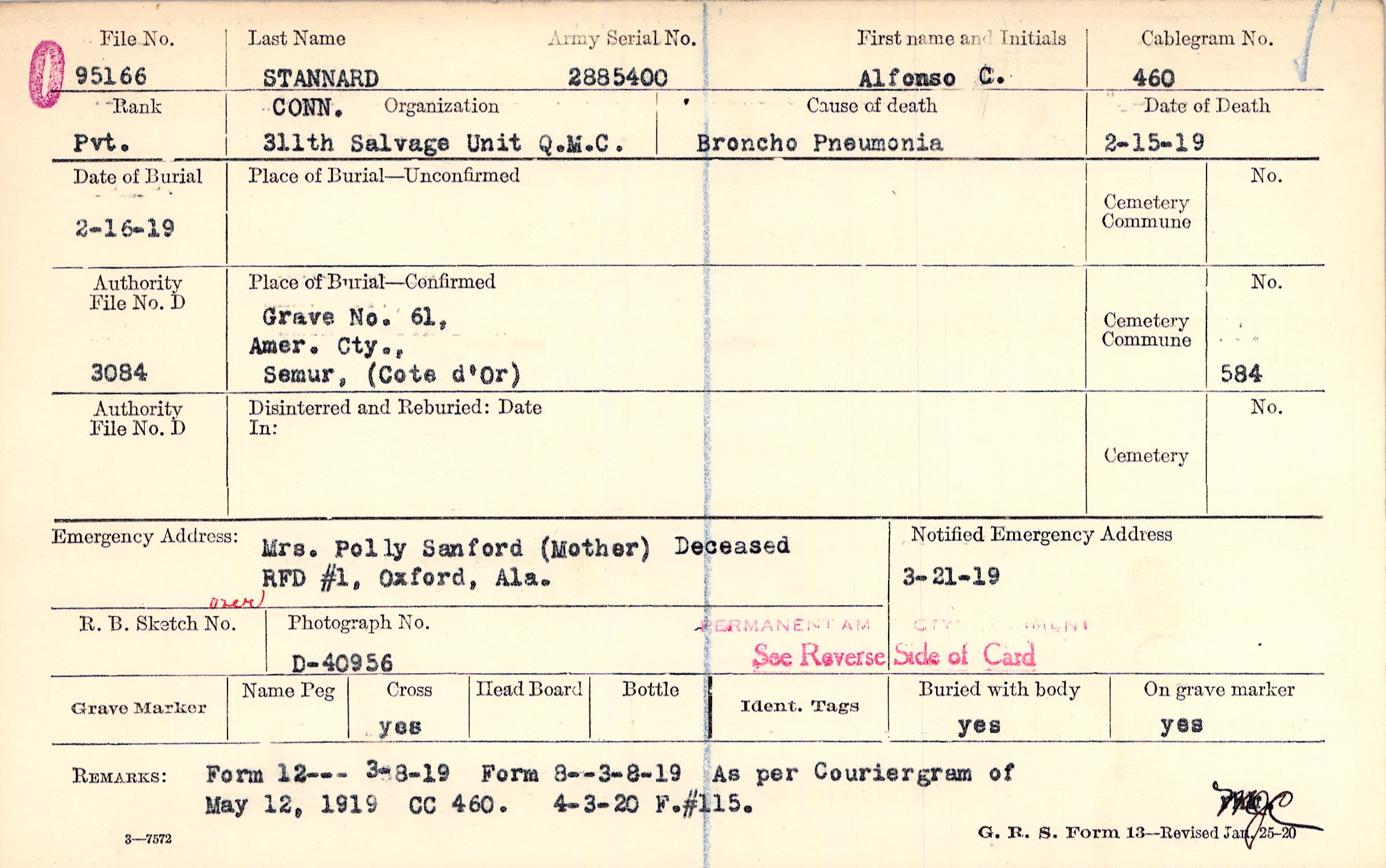 Mrs. Polly Sanford (Mother), RFD #1, Oxford, Ala., Deceased over