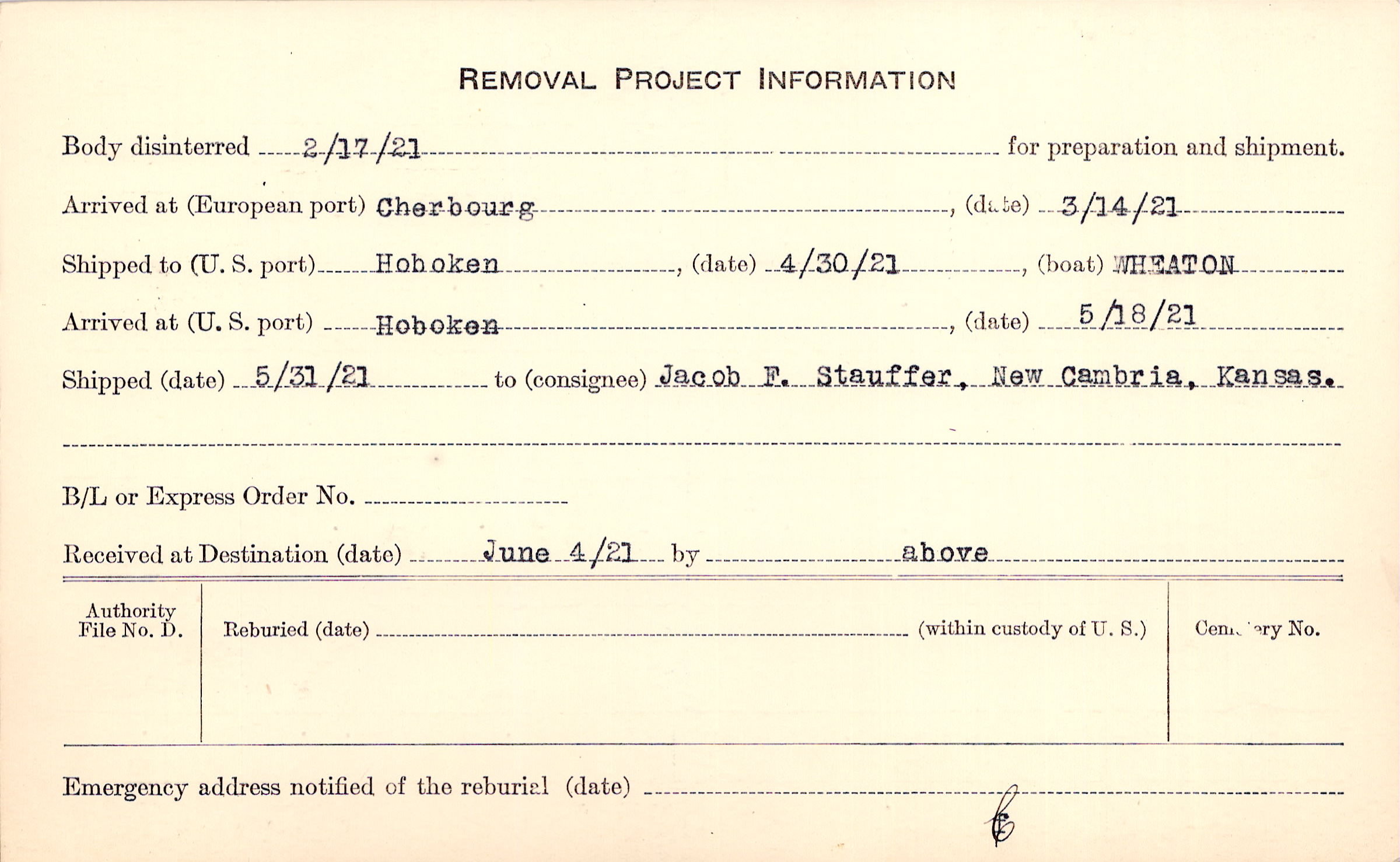 to Jacob F. Stauffer, new Cambria, Kansas.