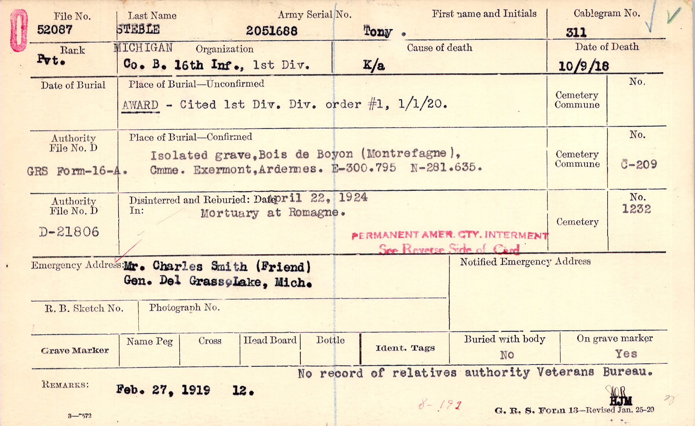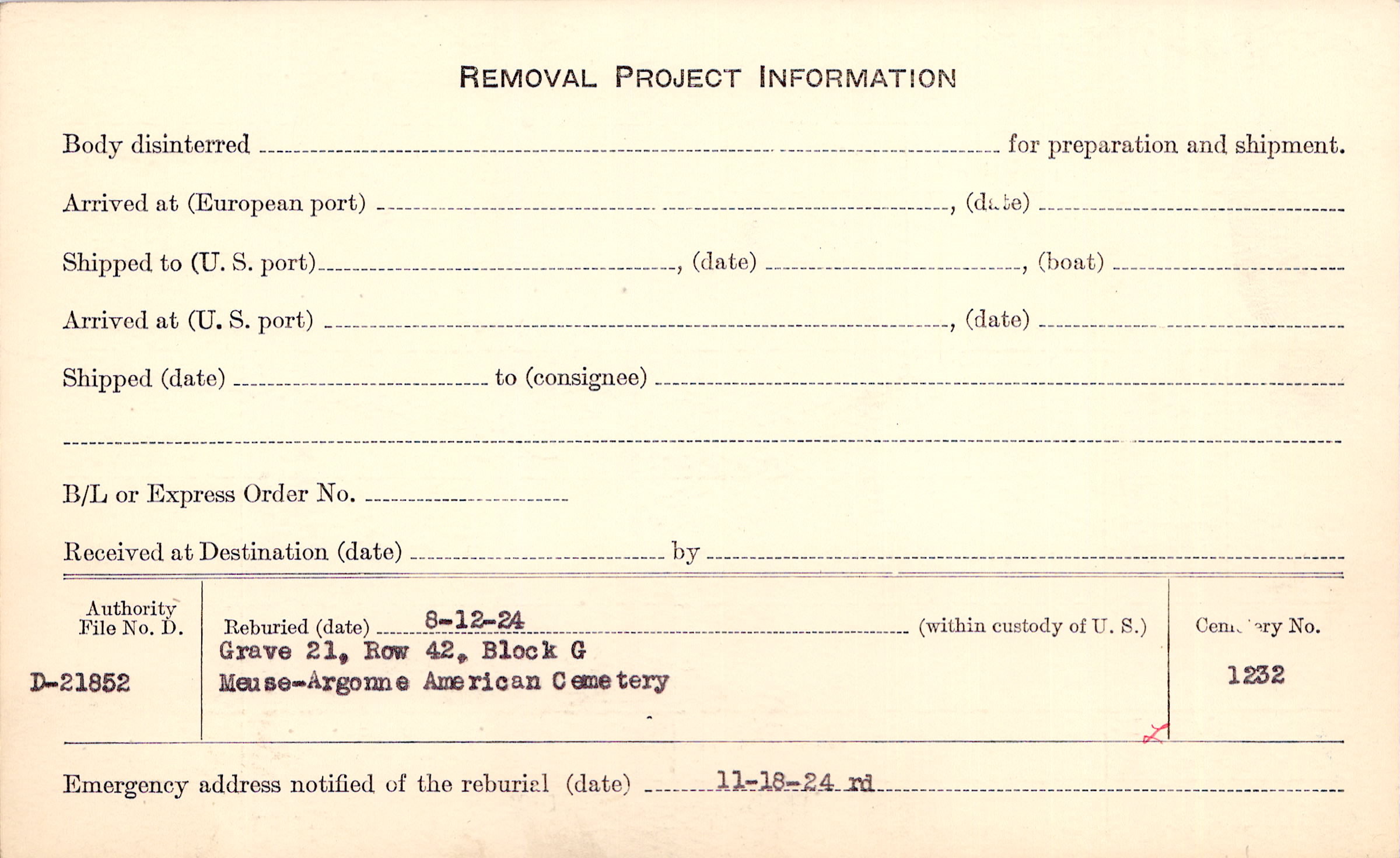 | Permanent Burial in Foreign Cemetery |