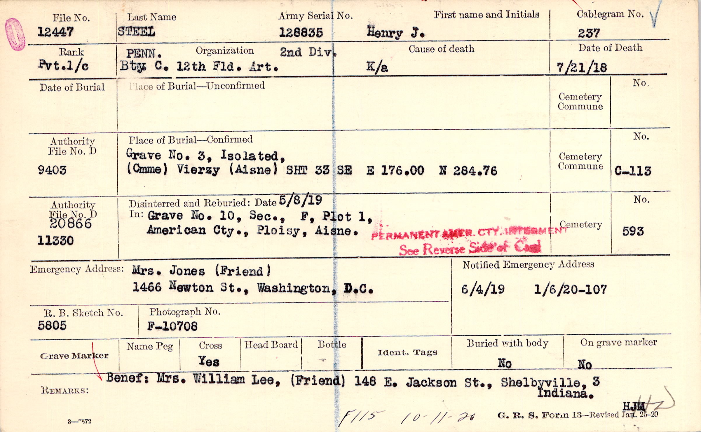 Grave 10, Section F, Plot 1, American B/A Cemetery, Ploisy, Aisne