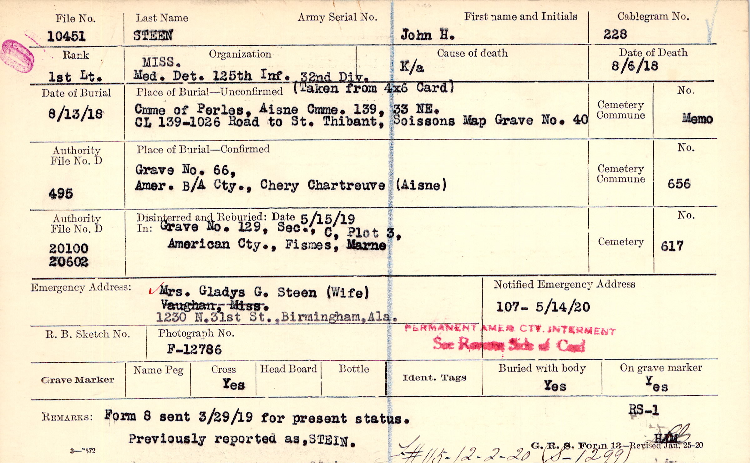 Mrs. Gladys G. Steen (Wife), 1230 N. 31st St., Birmingham, Ala.
