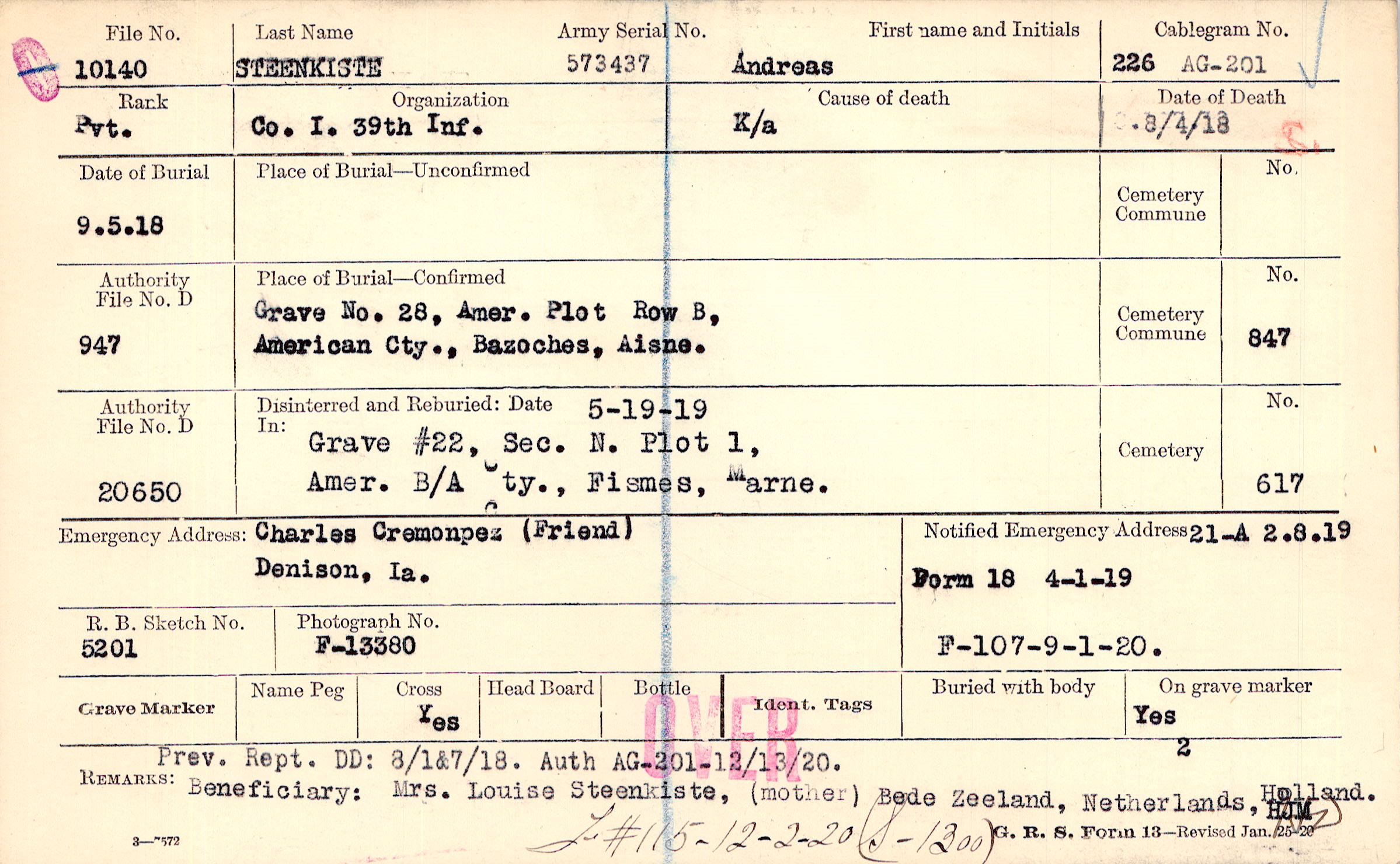 Grave 28, Amer. Plot, Row B, American Cty., Bazoches, Aisne.