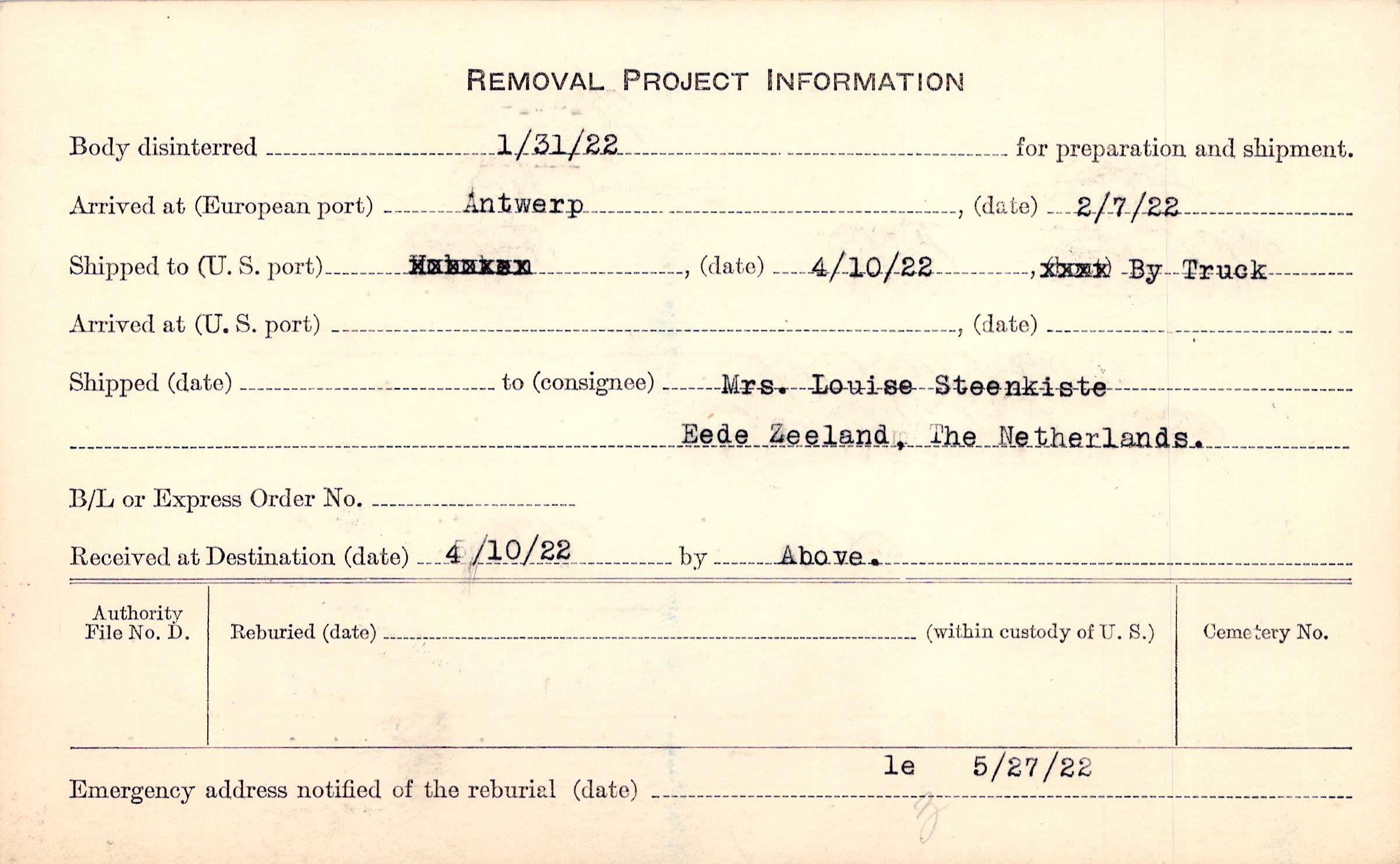 Body disinterred 1/31/1922 for preparation and shipment.
