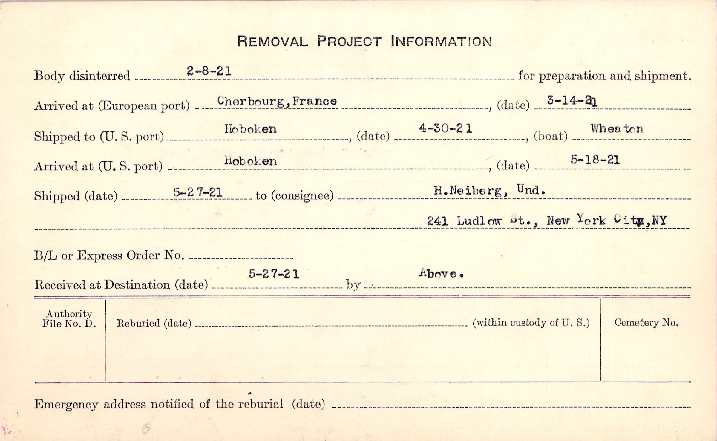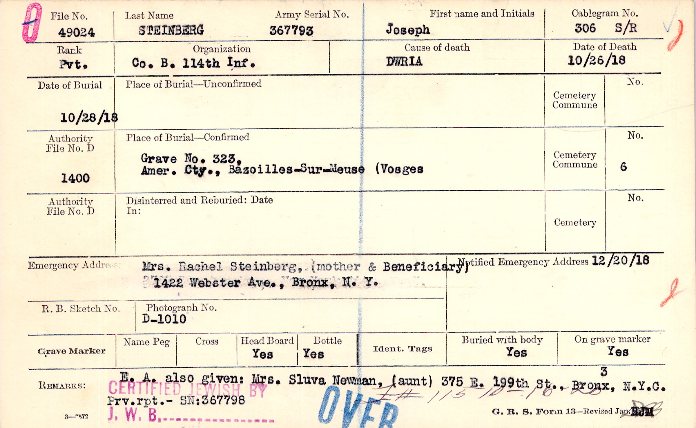 E.A. also given: Mrs. Sluva Newman, (aunt) 375 E. 199th St., Bronx, N.Y.C. Prv. rpt.- SN:367798, F# 115 10-10-20