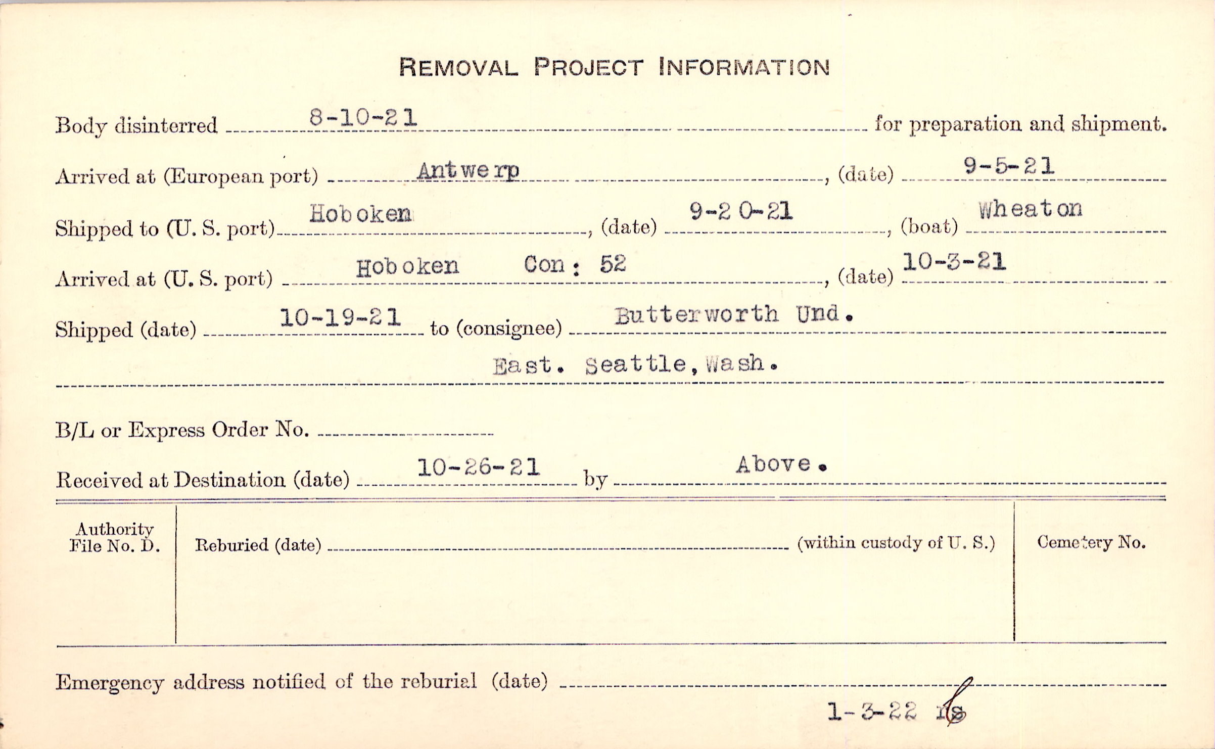 Body disinterred 8/10/1921 for preparation and shipment.