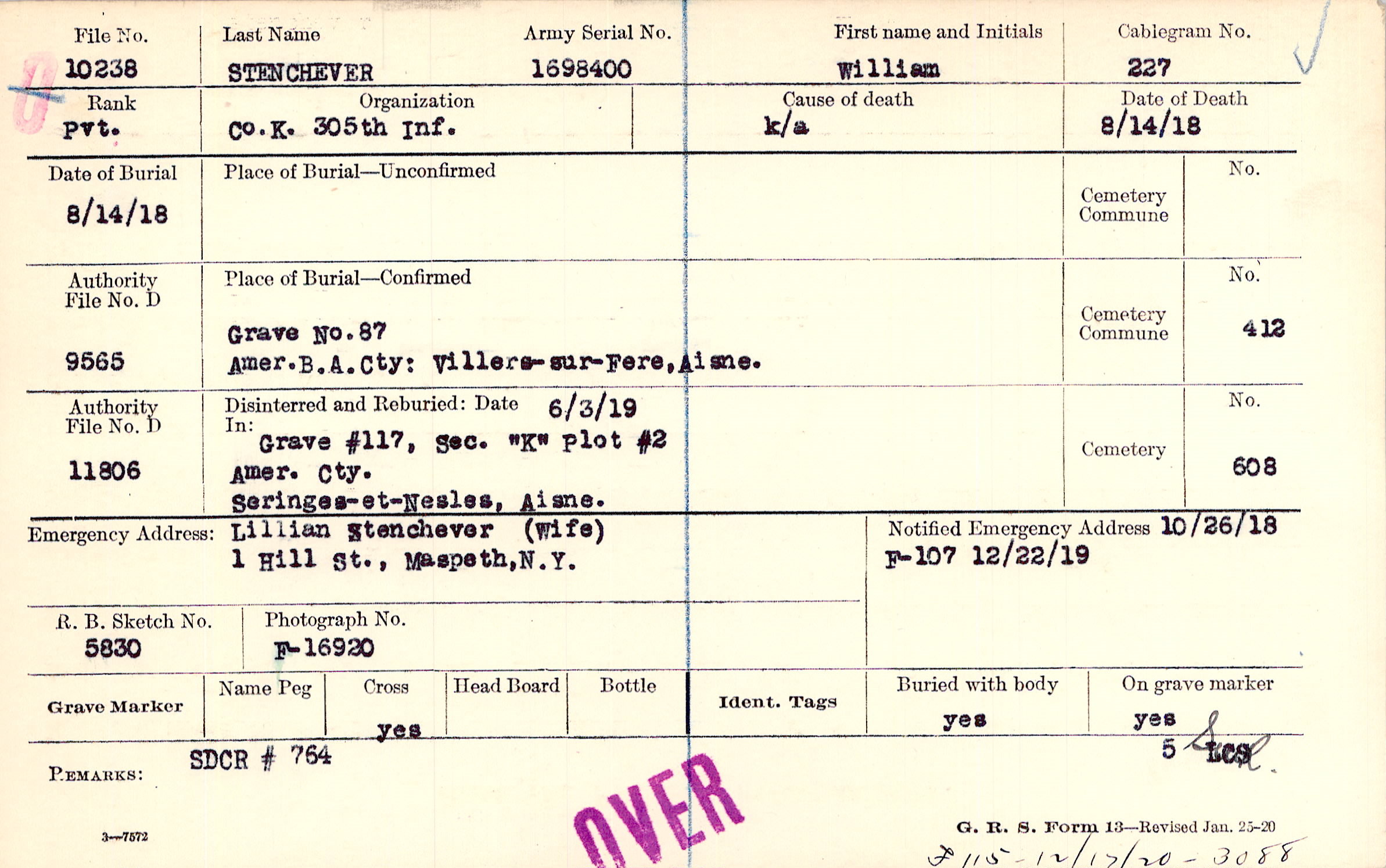 Lillian Stenchever (Wife), 1 Hill St., Maspeth,N.Y.