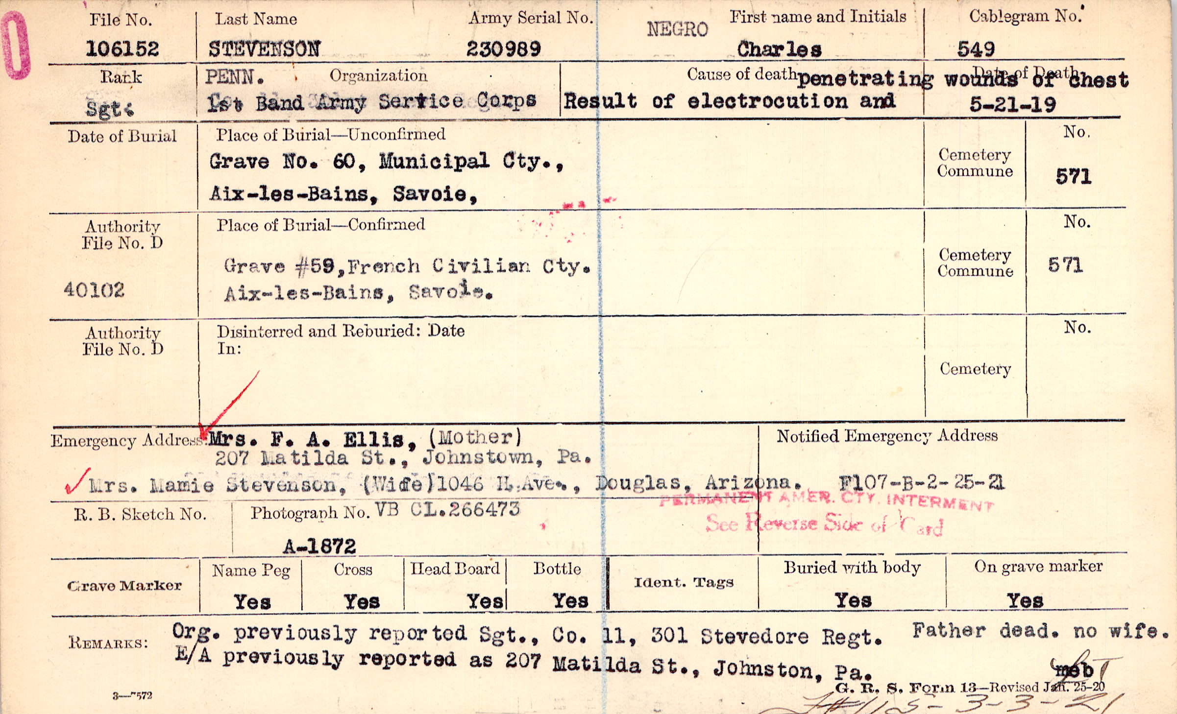 Mrs. F. A. Ellis, (Mother), 207 Matilda St., Johnstown, Pa., Mrs. Mamie Stevenson, (Wife) 1046 H Ave., Douglas, Arizona. VB CL.266473