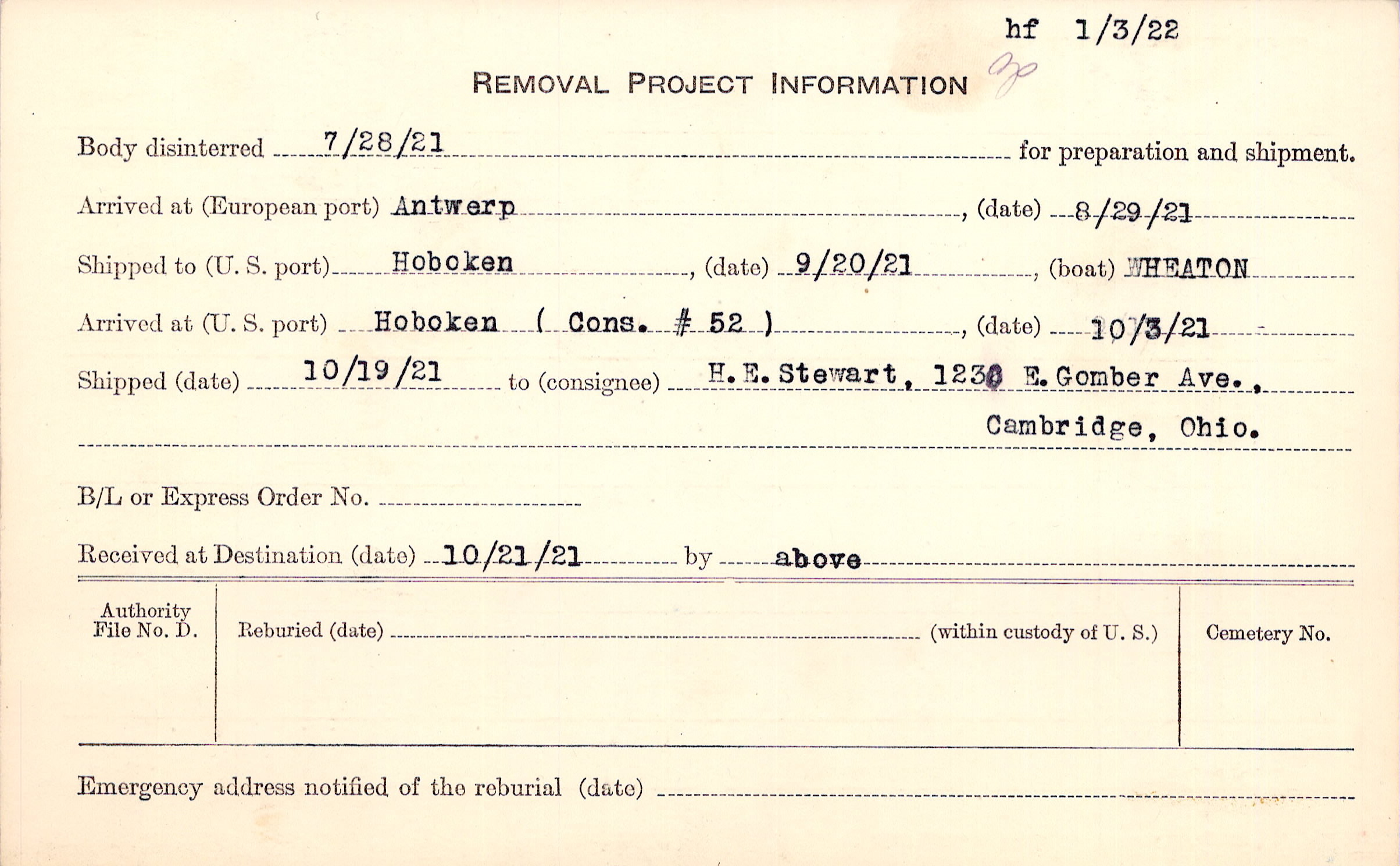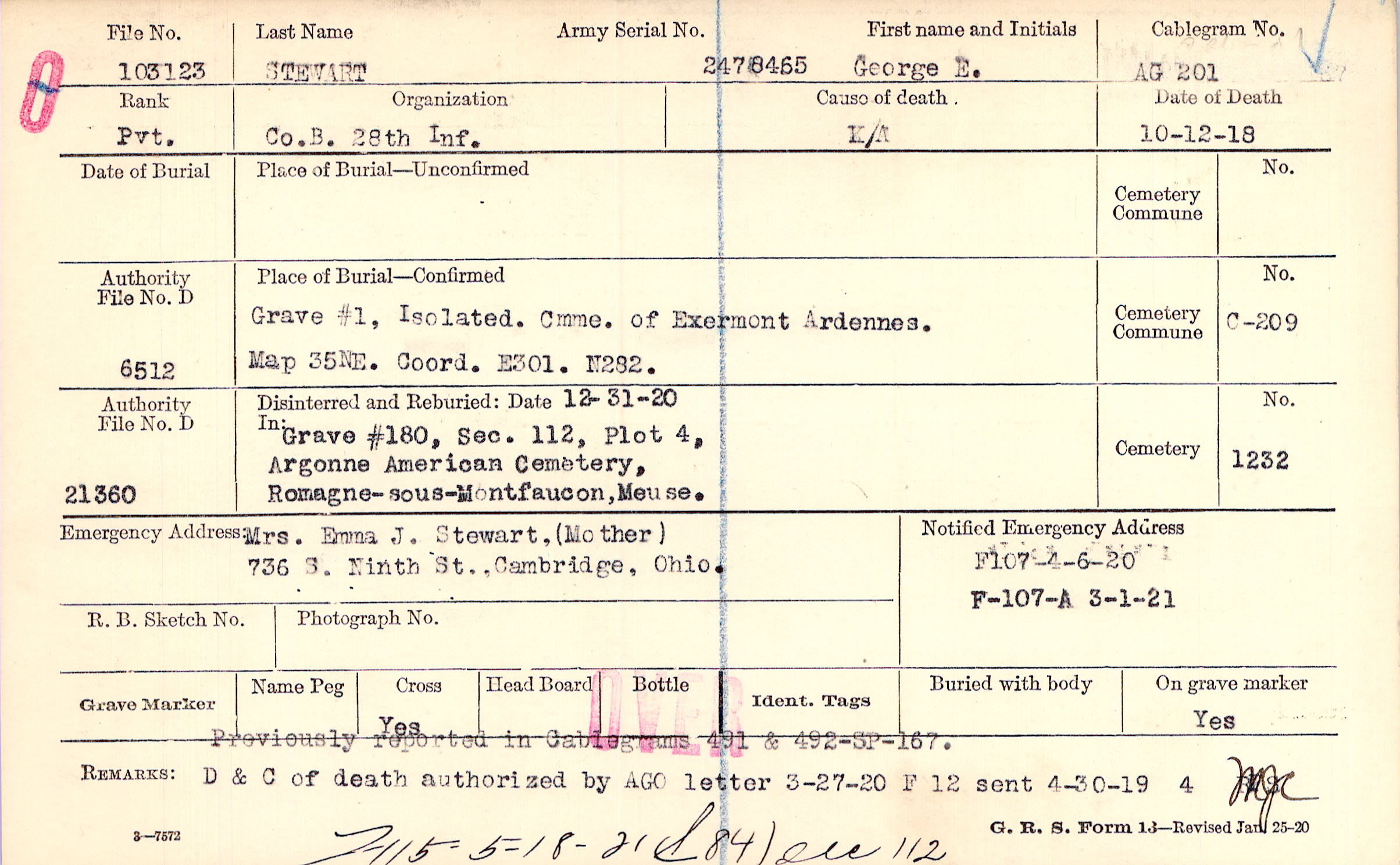 Mrs. Emma J. Stewart, (Mother), 736 S. Ninth St. , Cambridge, Ohio.
