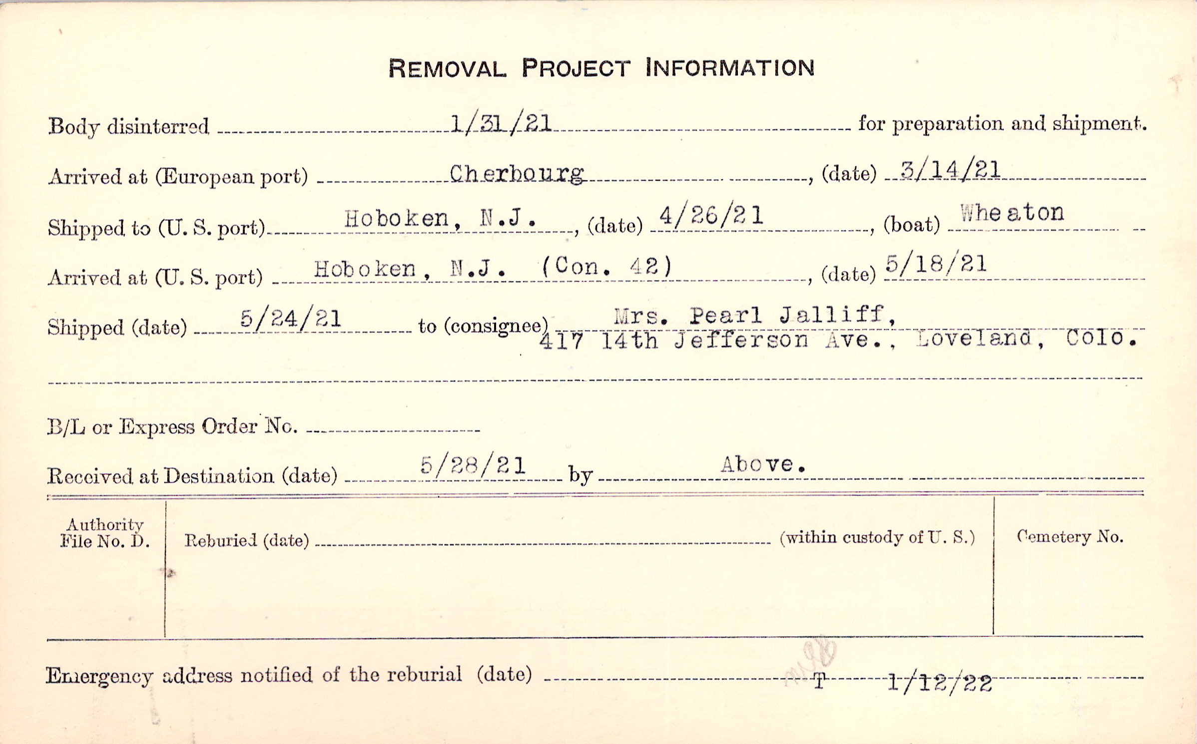 Body disinterred 1/31/1921 for preparation and shipment.
