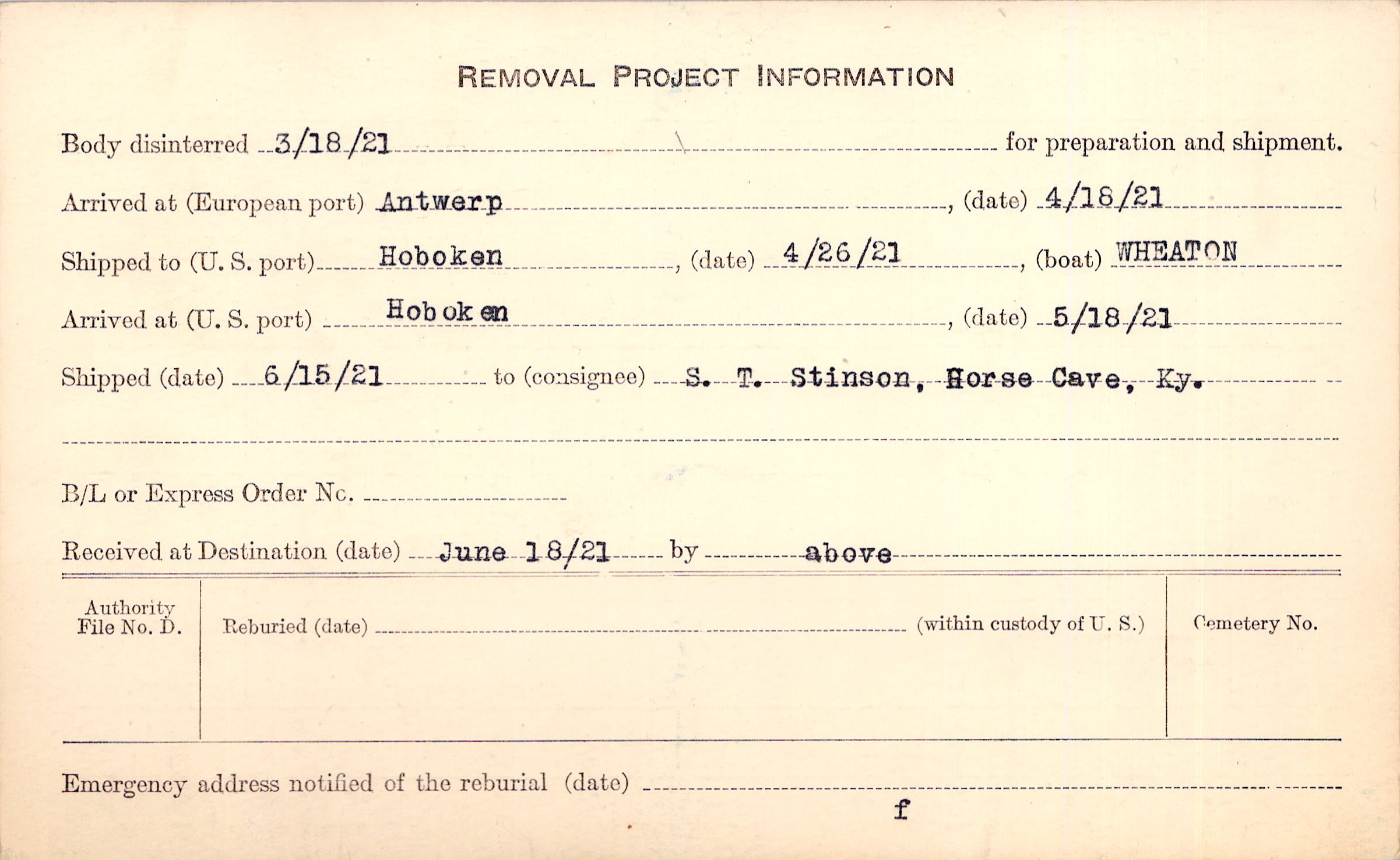 Body disinterred 3/18/1921 for preparation and shipment.