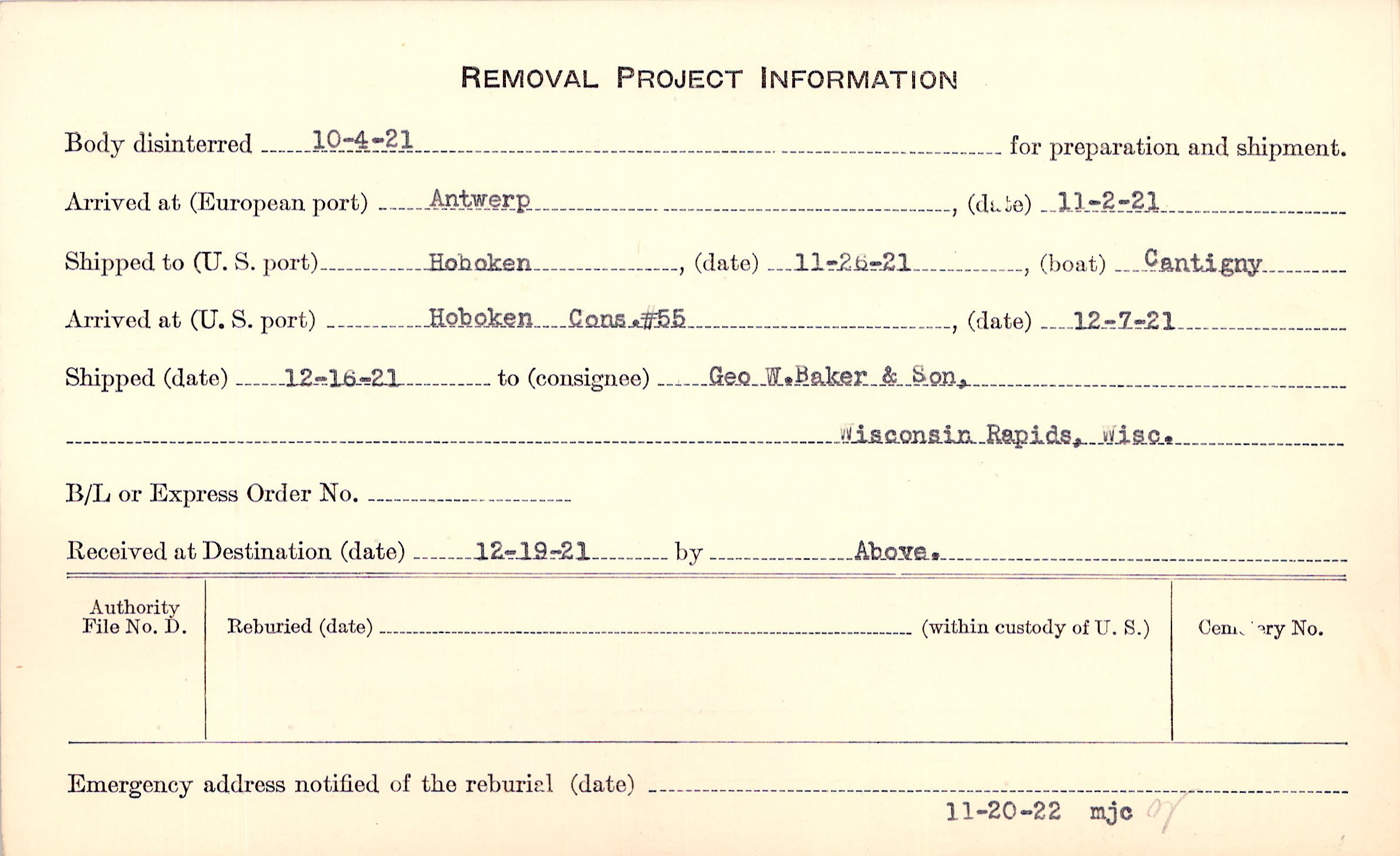 Body disinterred 10/4/1921 for preparation and shipment.