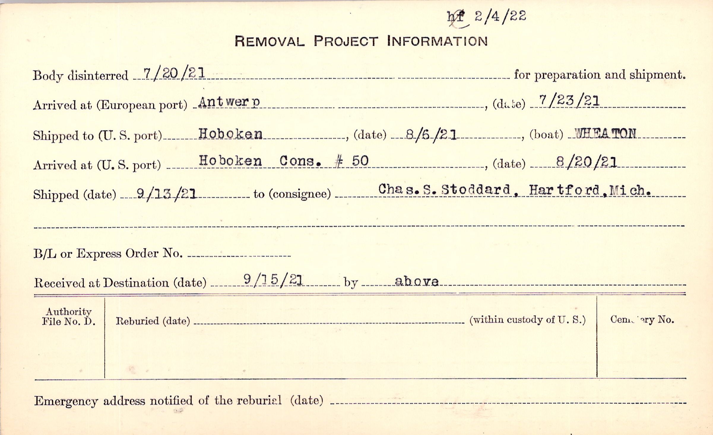 Body disinterred 7/20/1921 for preparation and shipment.