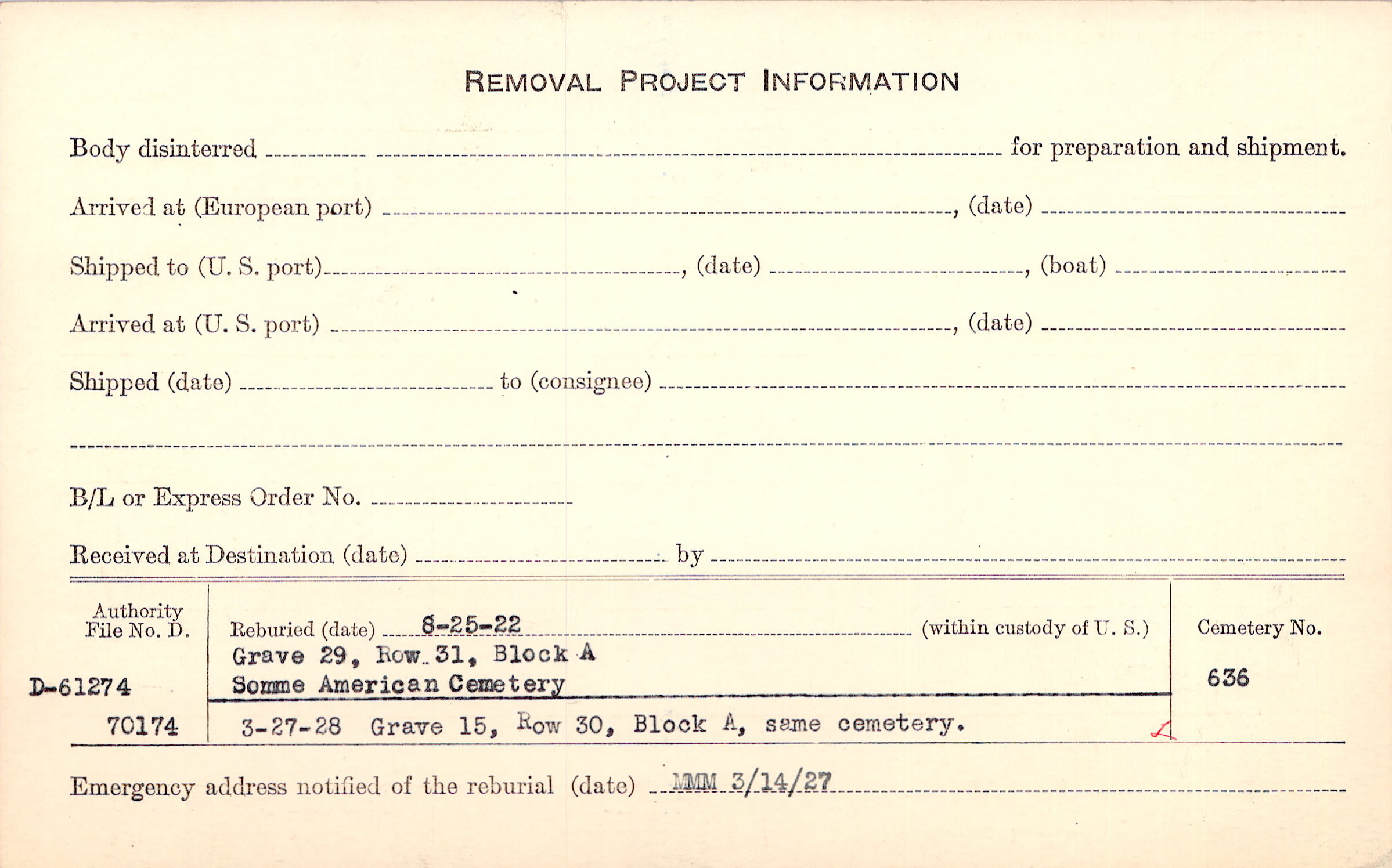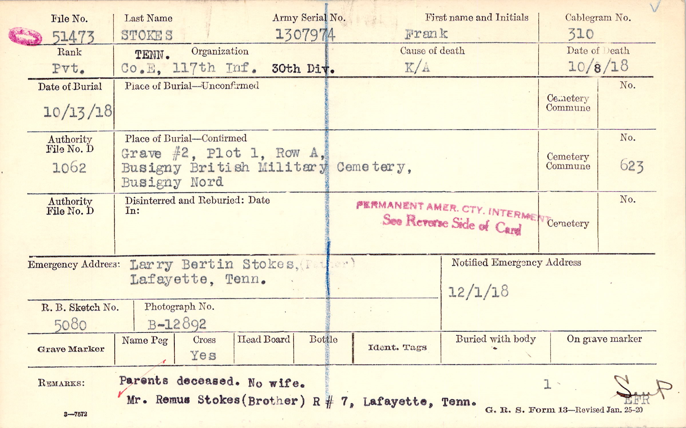 Parents deceased. No wife, Mr. Remus Stokes (Brother), R#7, Lafayette, Tenn.