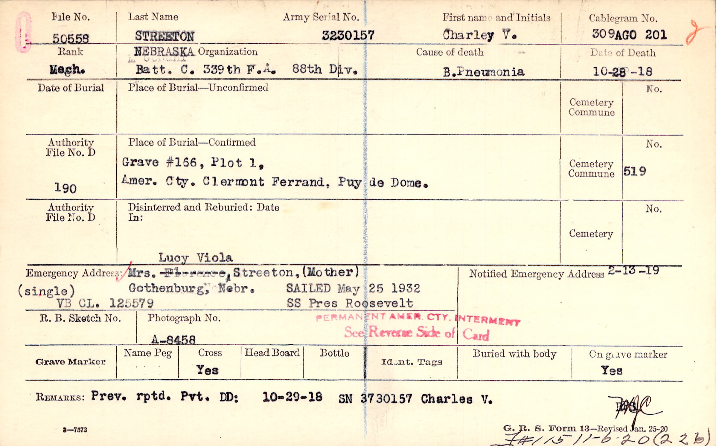 Grave #166, Plot 1, Amer. Cty., Clermont Ferrand, Puy de Dome