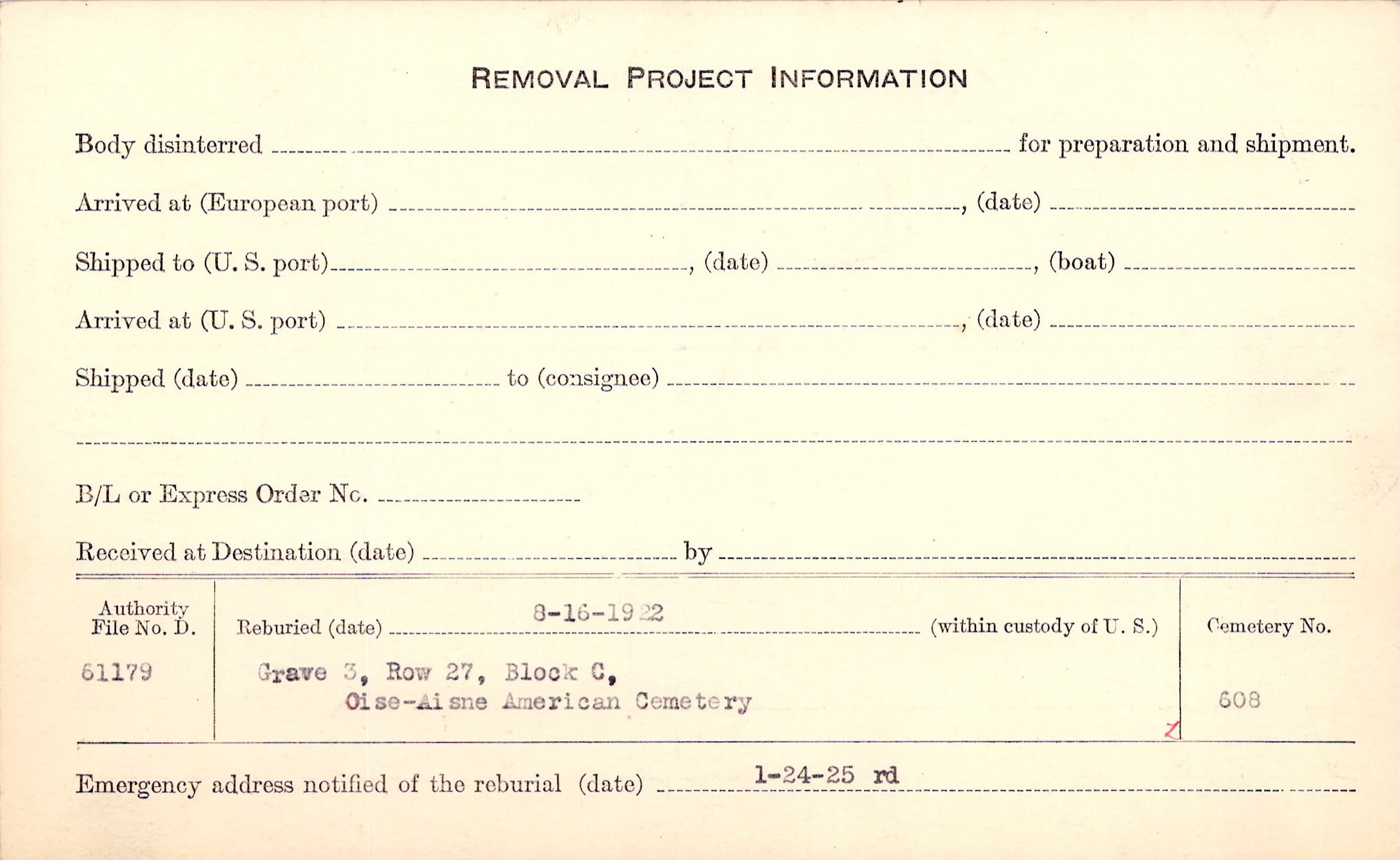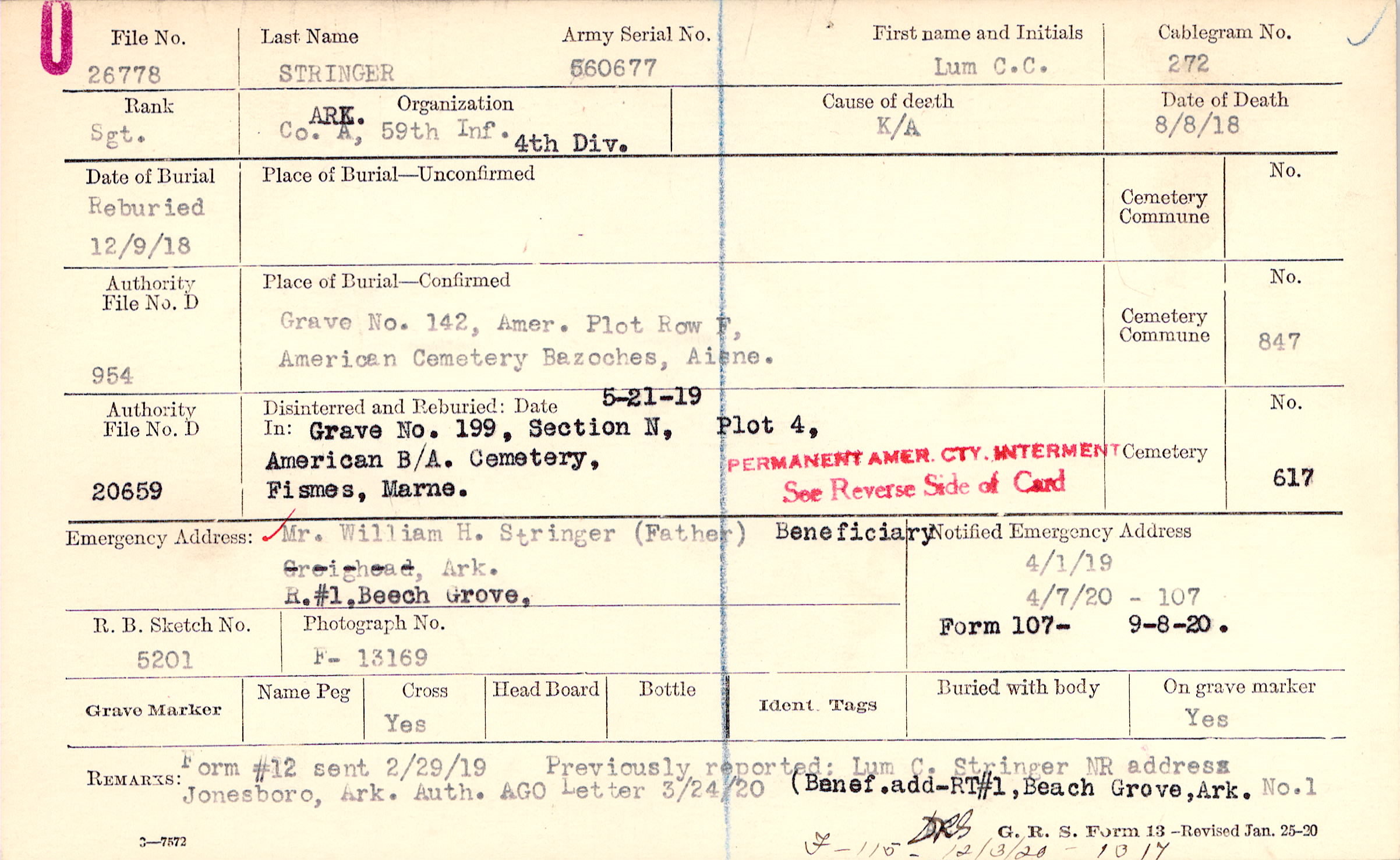 Grave 199, Section N, Plot 4, American B/A Cemetery, Fismes, Marne