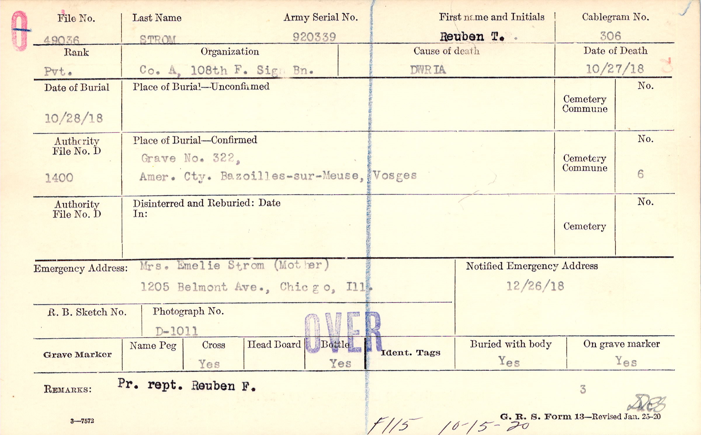 Mrs. Emelie Strom (Mother), 1205 Belmont Ave., Chicago, Ill.