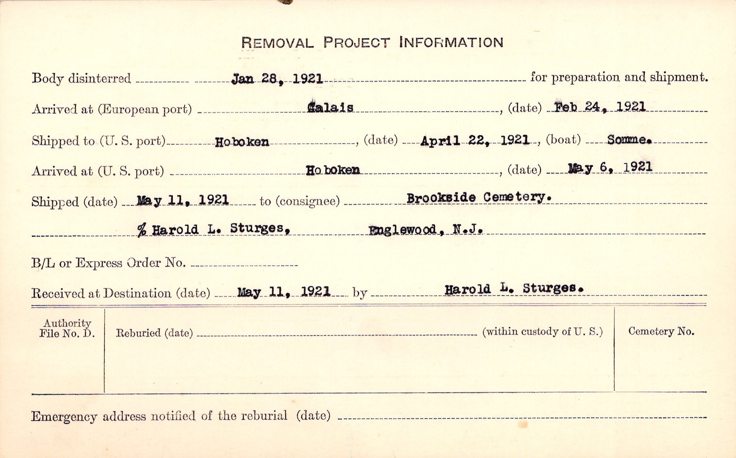 to Brookside Cemetery, % Harold L. Sturges, Englewood, N. J.