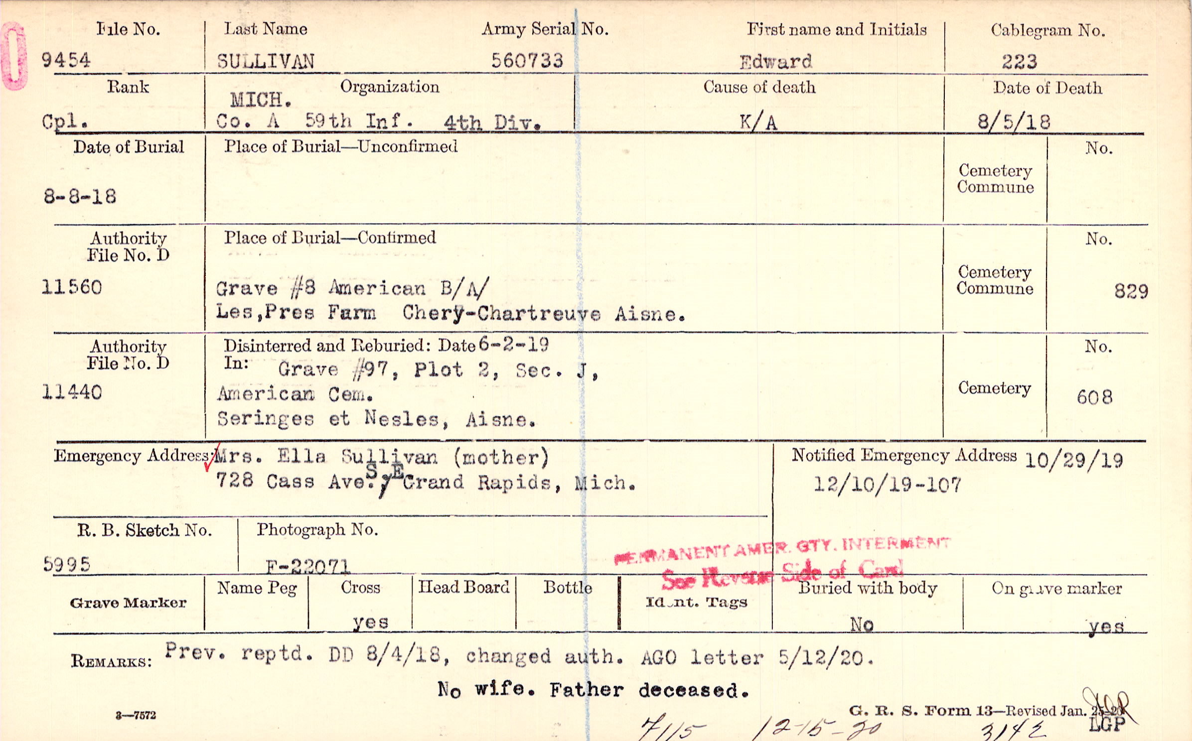Mrs. Ella Sullivan (mother), 728 Cass Ave., S.E. Grand Rapids, MIch.