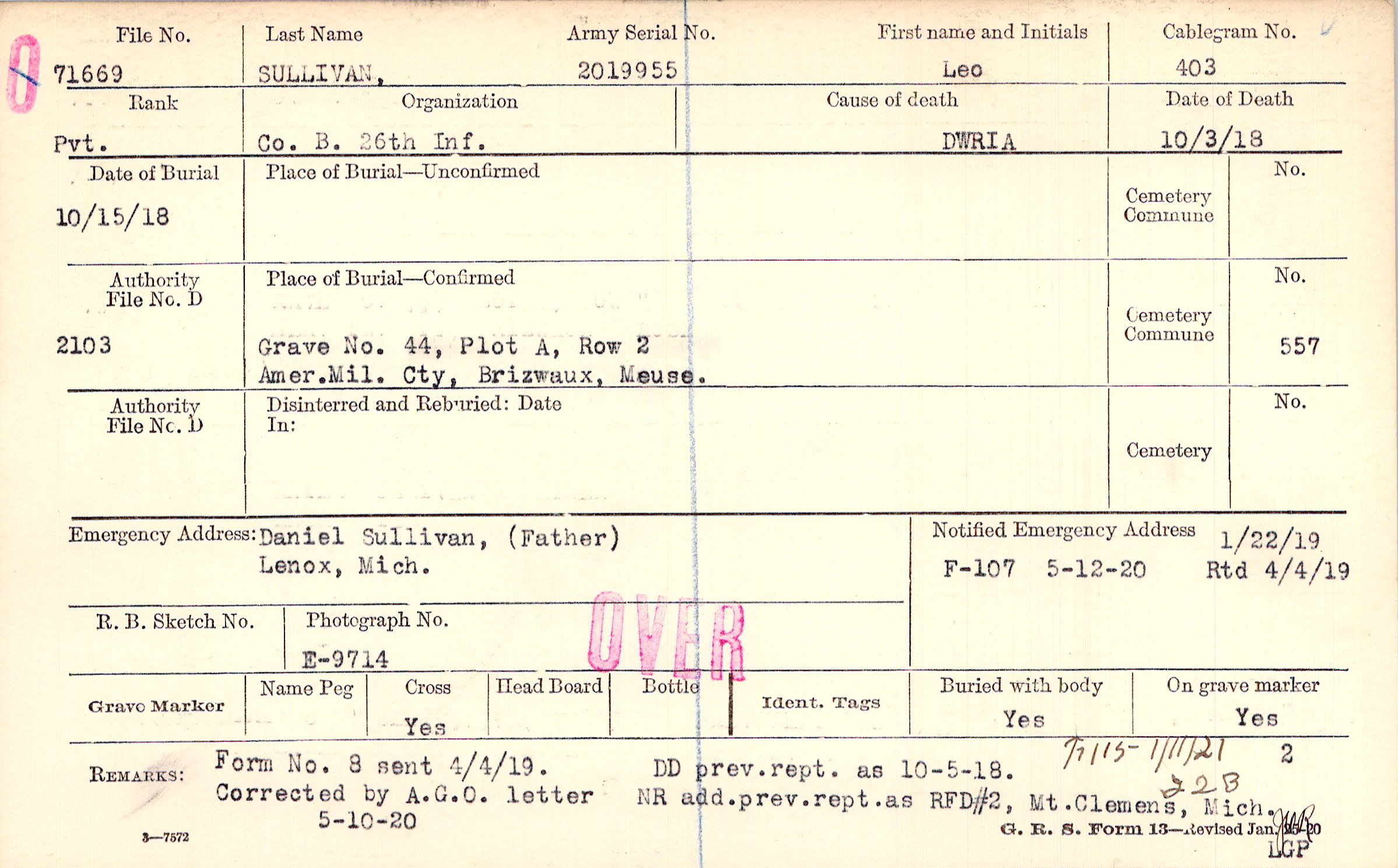 1/22/1919, Form 107: 5/12/1920, Rtd 4/4/1919