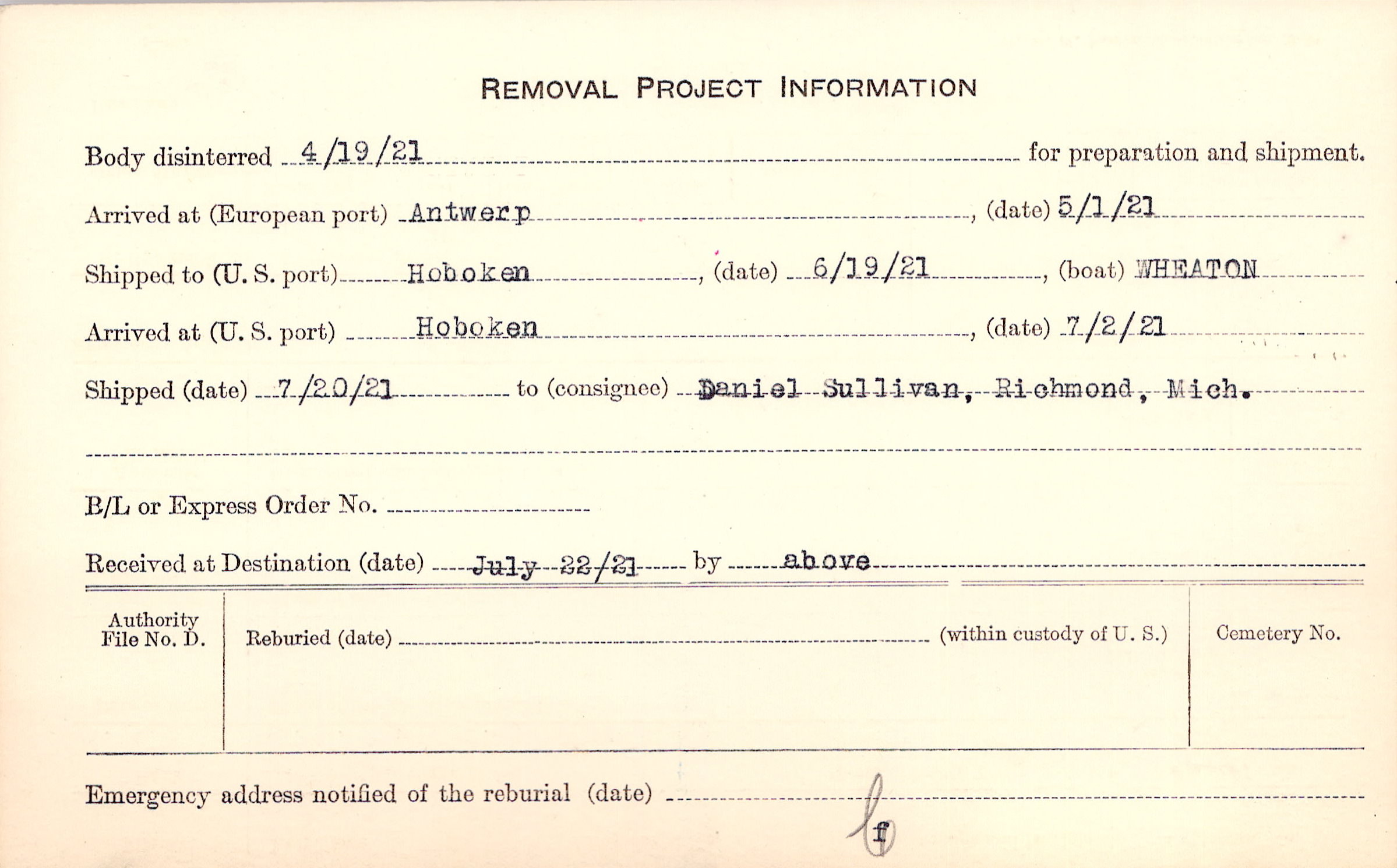 Body disinterred 4/19/1921 for preparation and shipment.