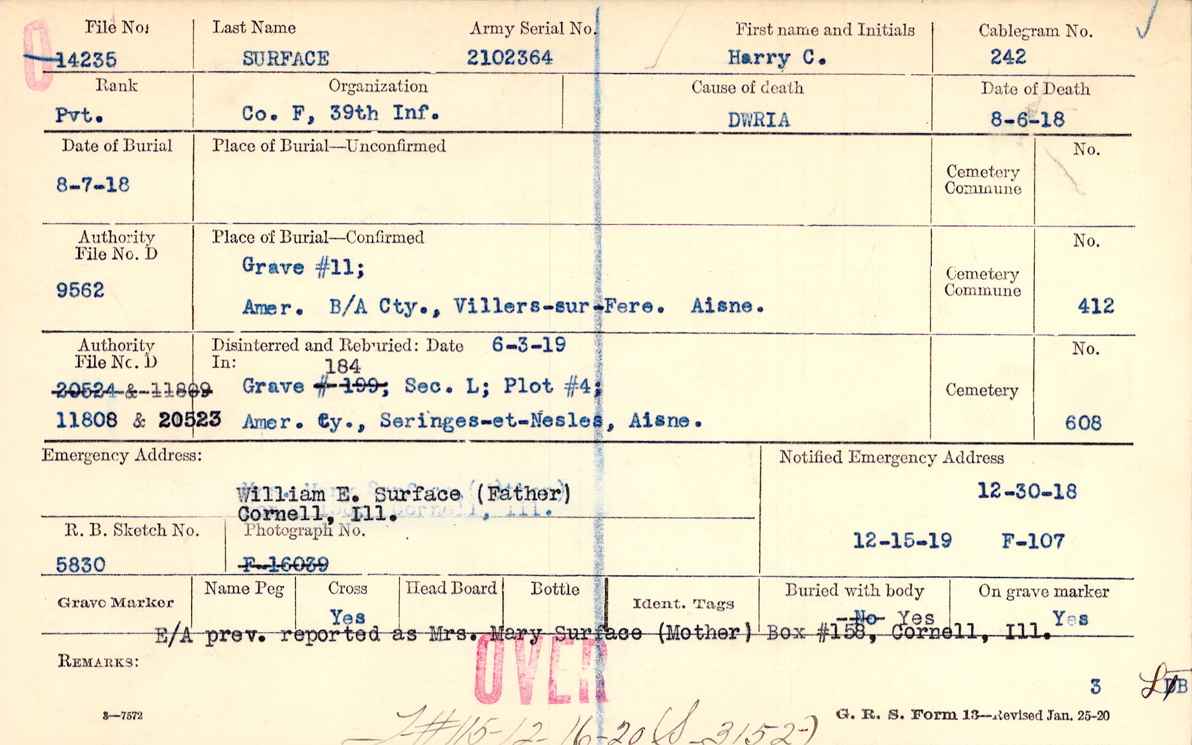E/A prev. reported as Mrs. Mary Surface,(Mother), Box 158, Cornell, Ill., F#115-12-16-20 (S_3152-)