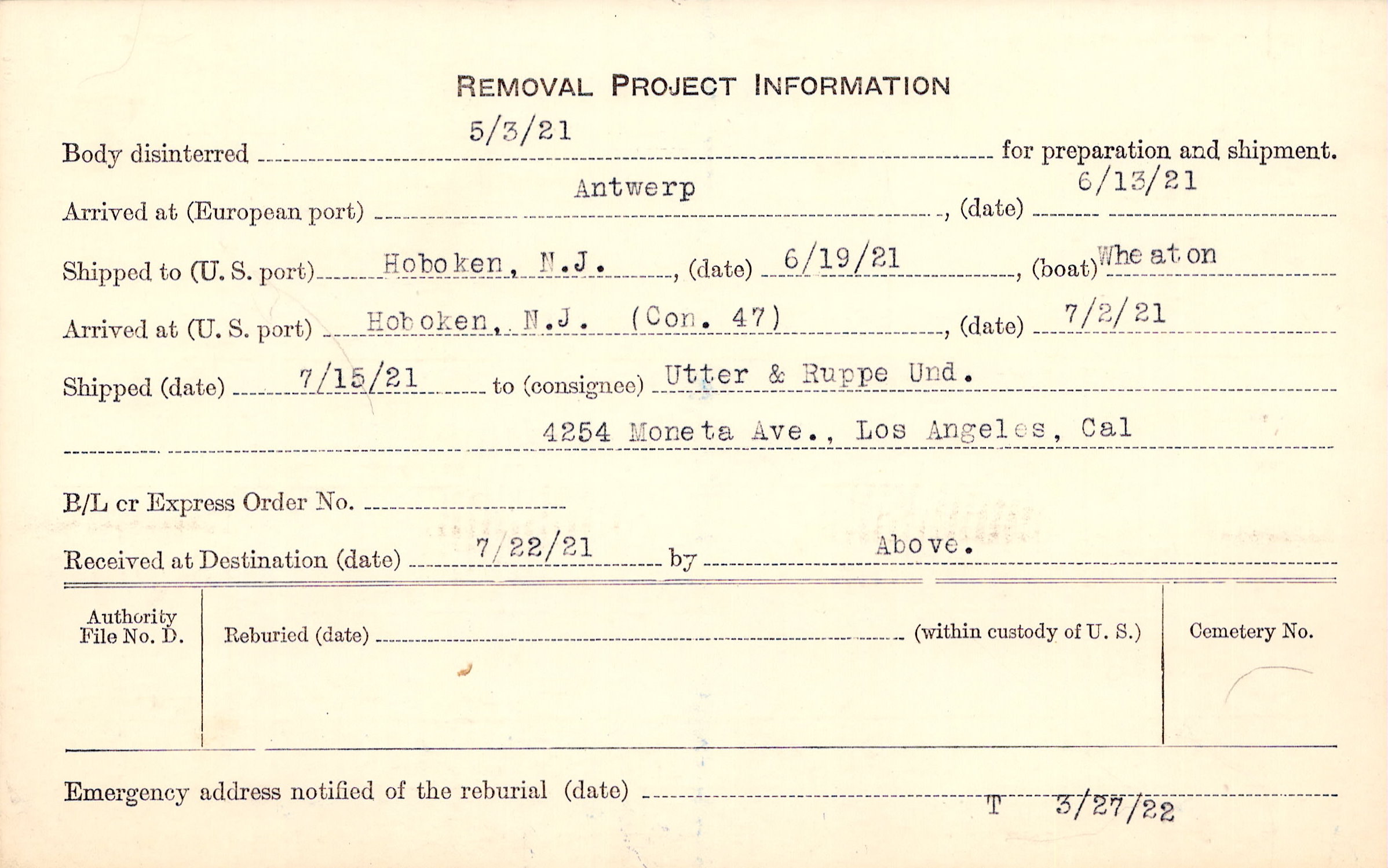 Body disinterred 5/3/1921 for preparation and shipment.