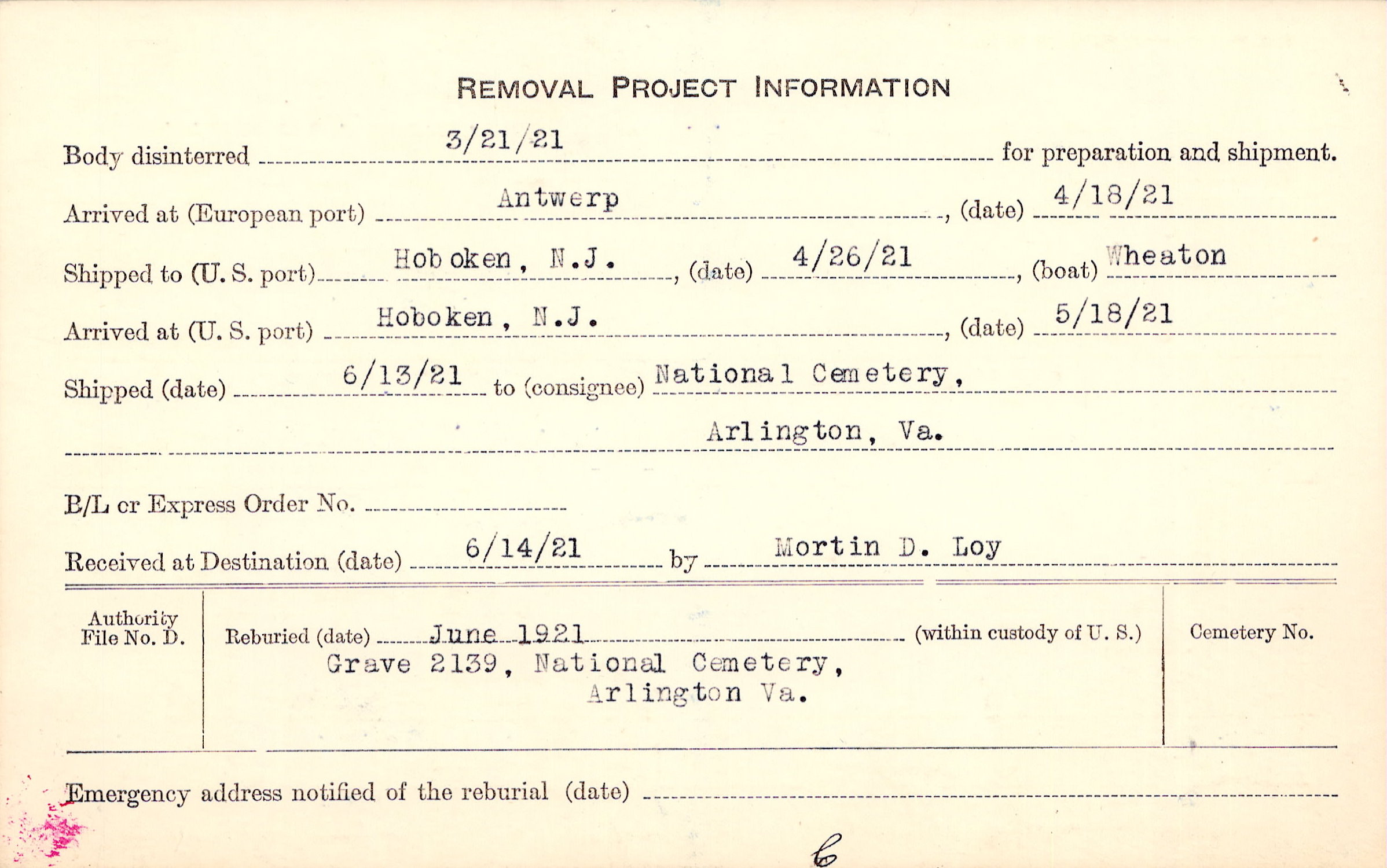 Body disinterred 3/21/1921 for preparation and shipment.