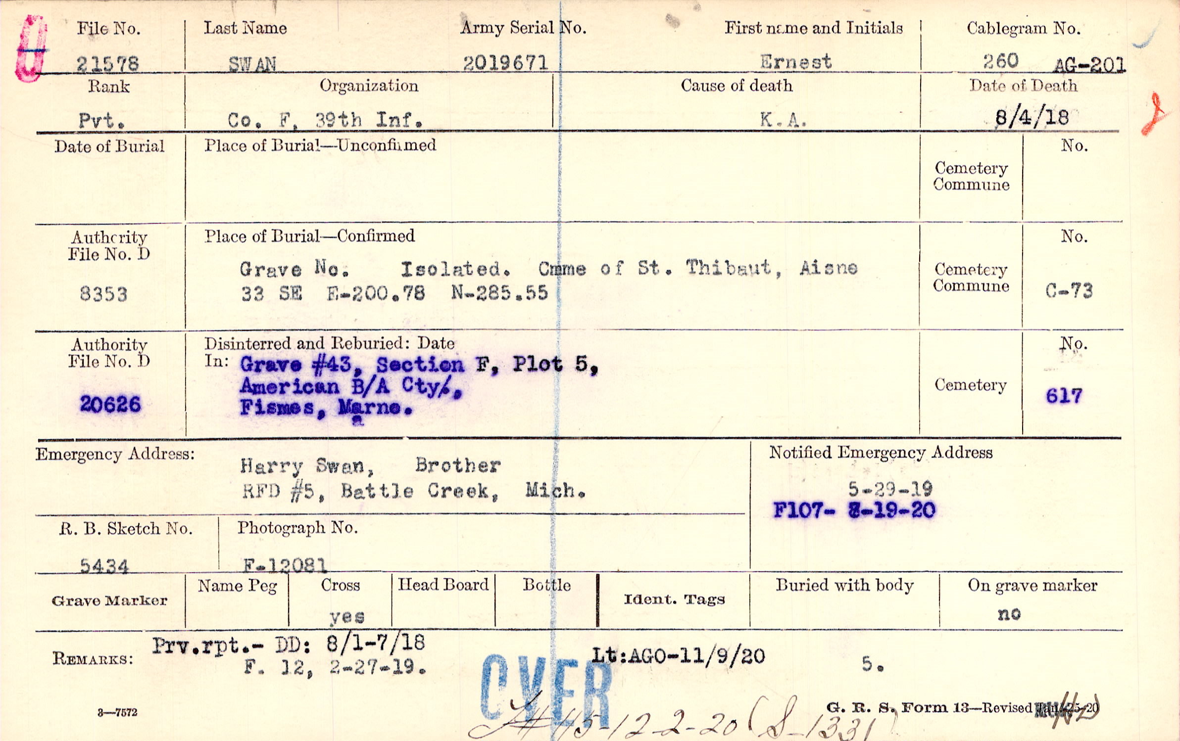 Grave 43, Section F, Plot 5, American B/A Cemetery, Fismes, Marne