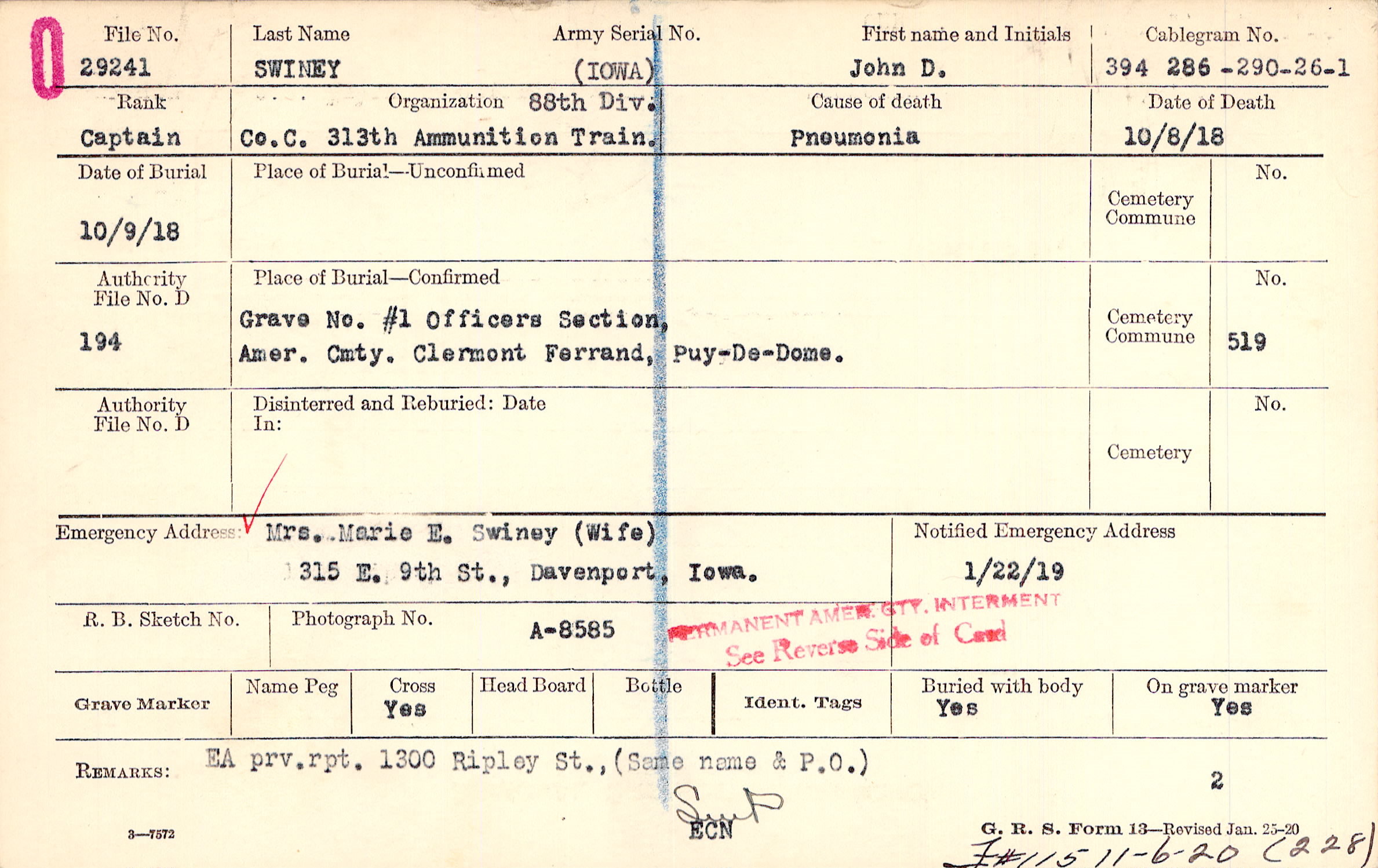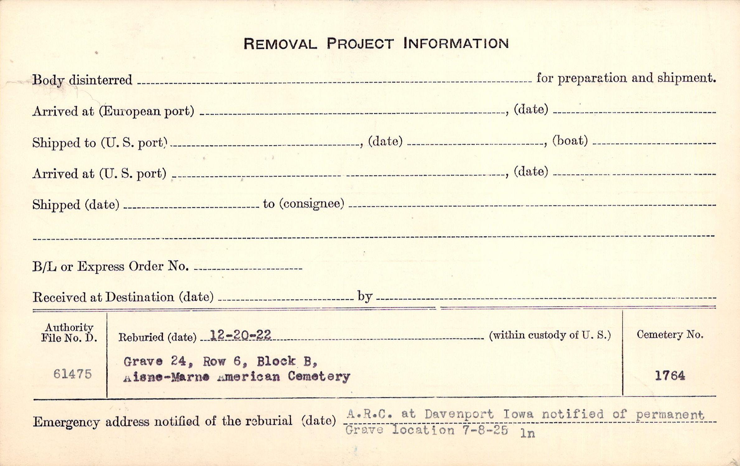 A.R.C. at Davenport Iowa notified of permanent Grave location |