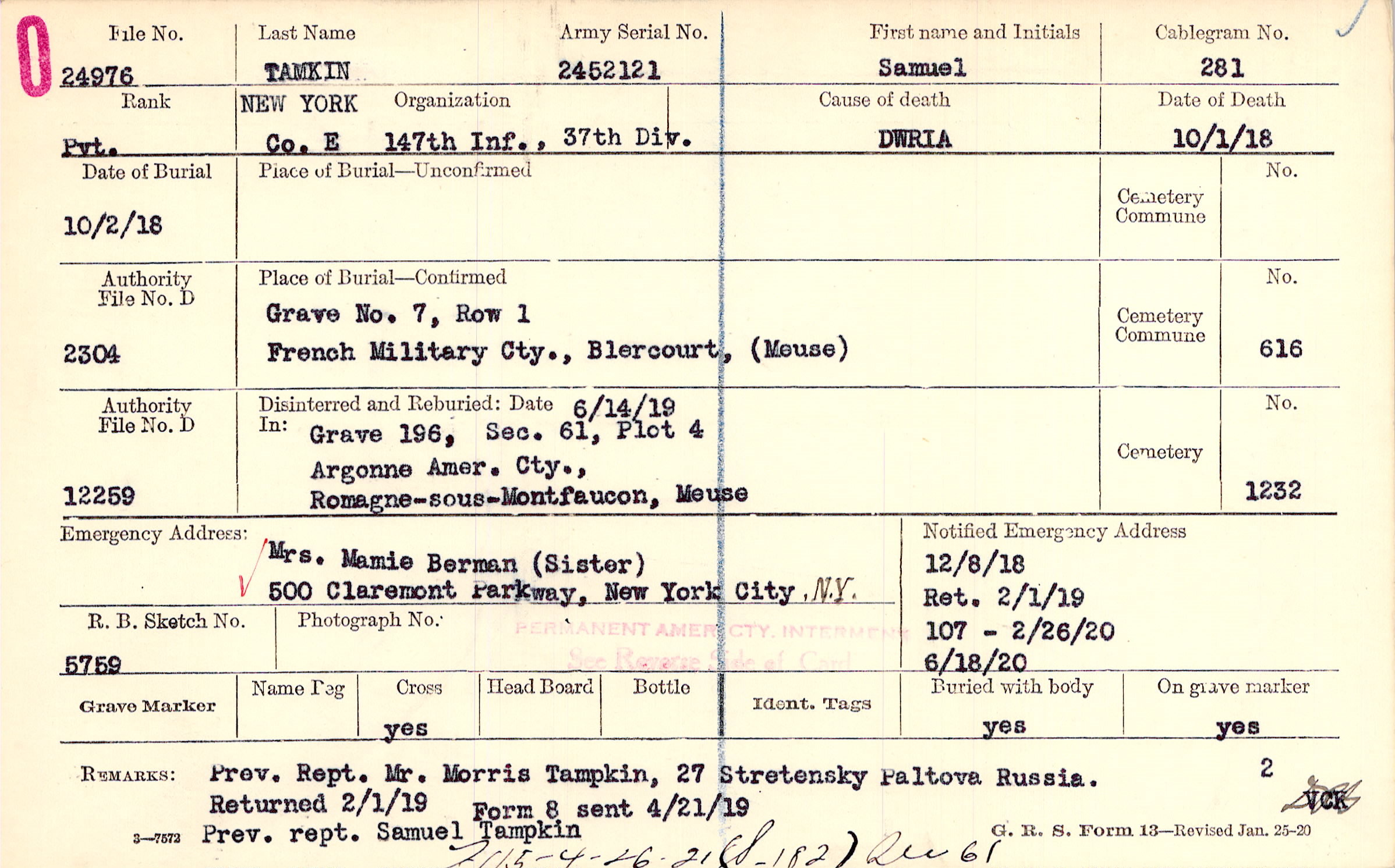 Prev. Reptile. Mr. Morris Tampkin, 27 Stretensky Paltova Russia. Returned 2/1/19 Prev. rept. Samuel Tampkin, Form 8 sent 4/21/19 Prev. rept. Samuel Tampkin, F115-4-26-21 (S_182) sec 61