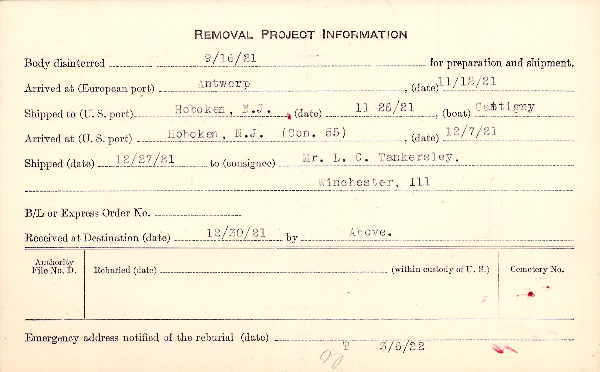 Body disinterred 9/16/1921 for preparation and shipment.