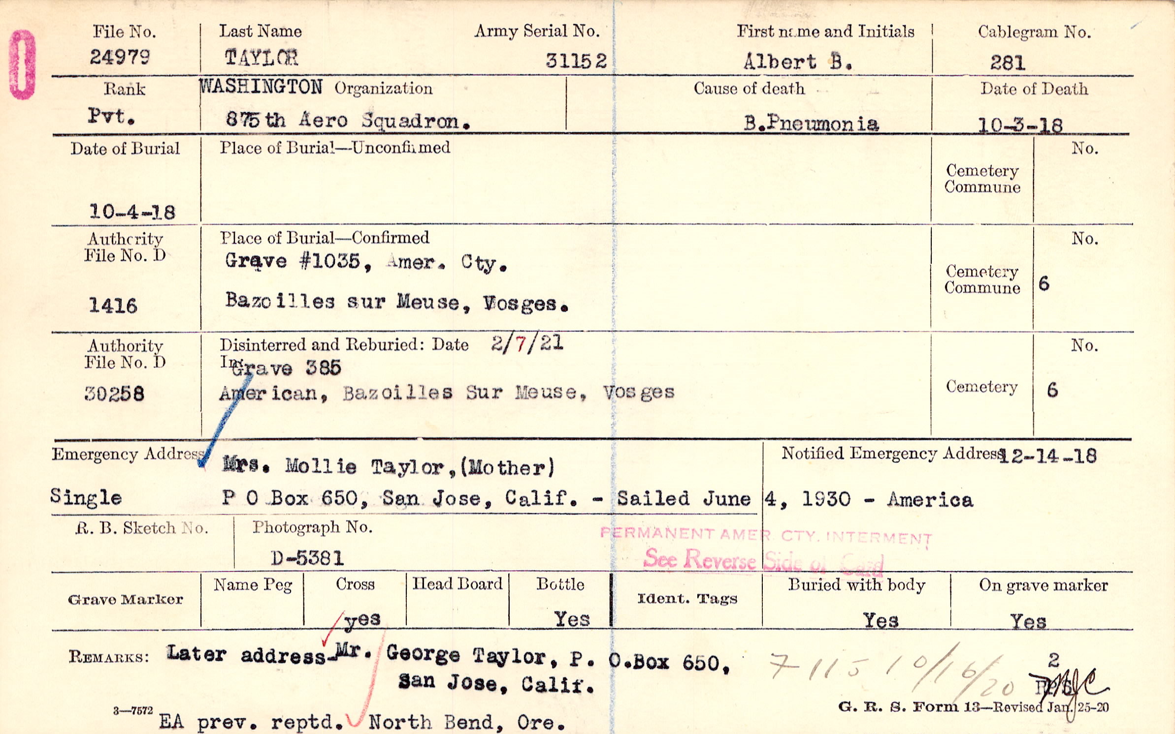 Mrs. Mollie Taylor (Mother), P O Box 650, San Jose, Calif. -, Single - Sailed June 4, 1930 - America