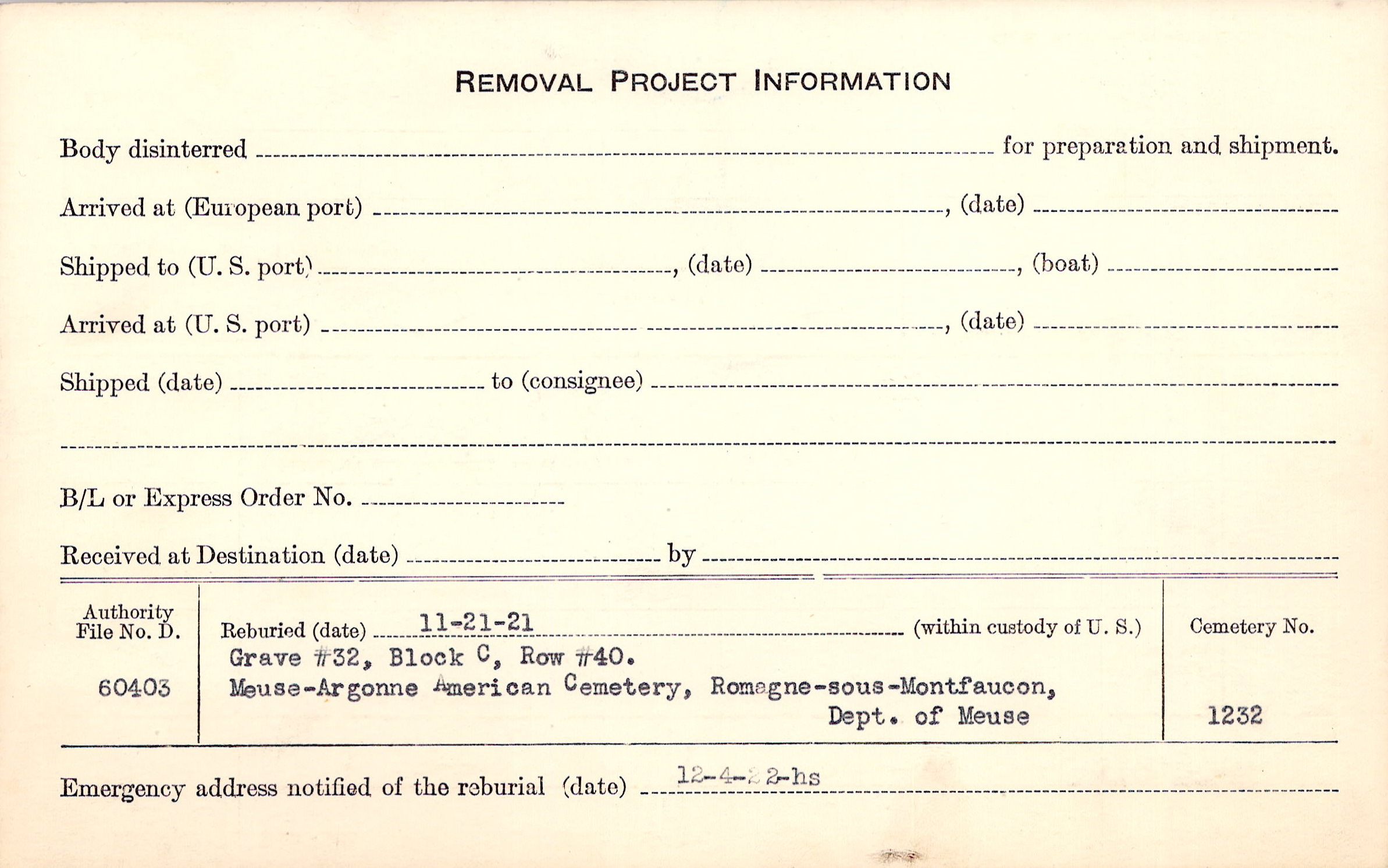 | Permanent Burial in Foreign Cemetery |