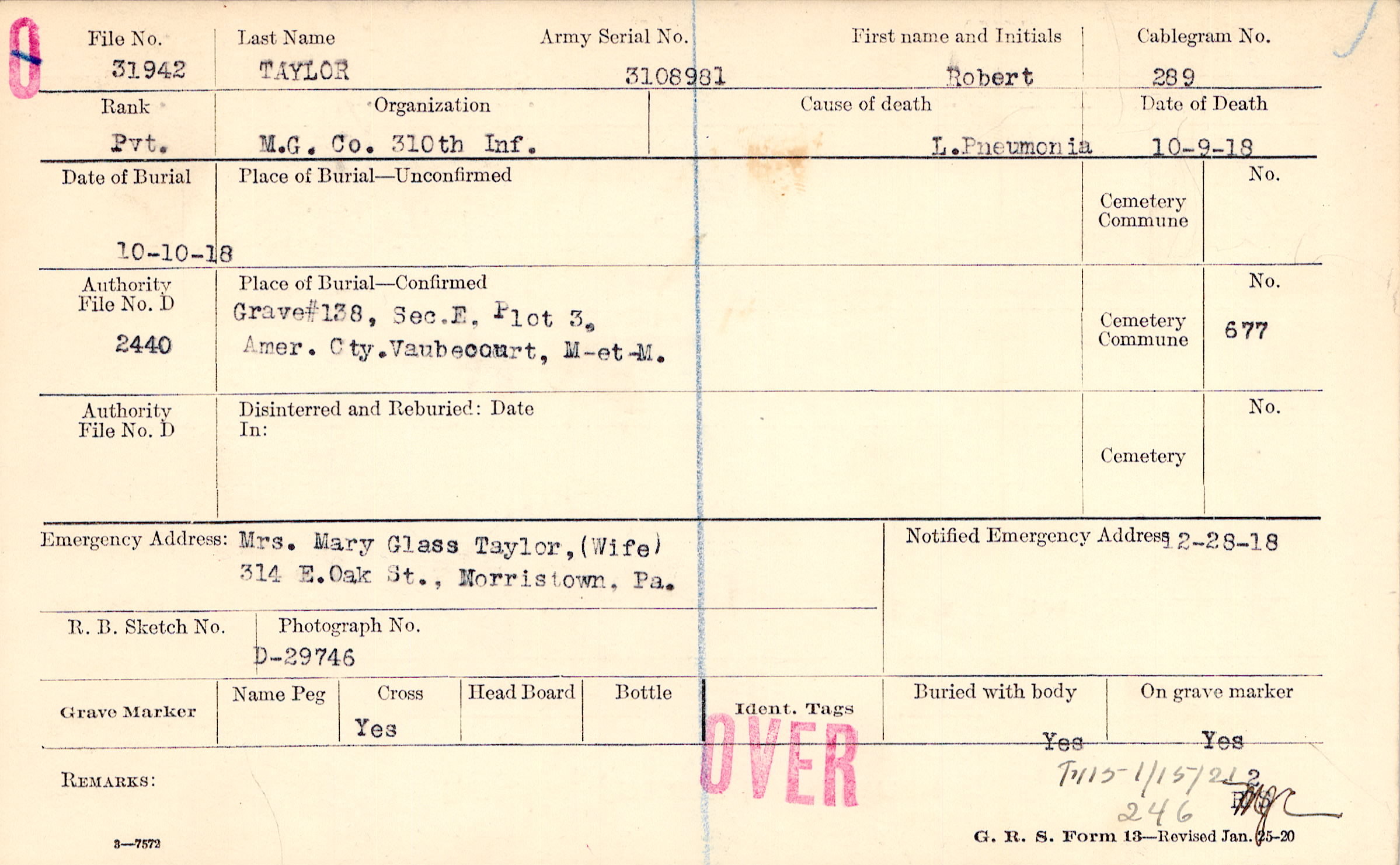 Mrs. Mary Glass Taylor, (Wife), 314 E. Oak St., Morristown, Pa.