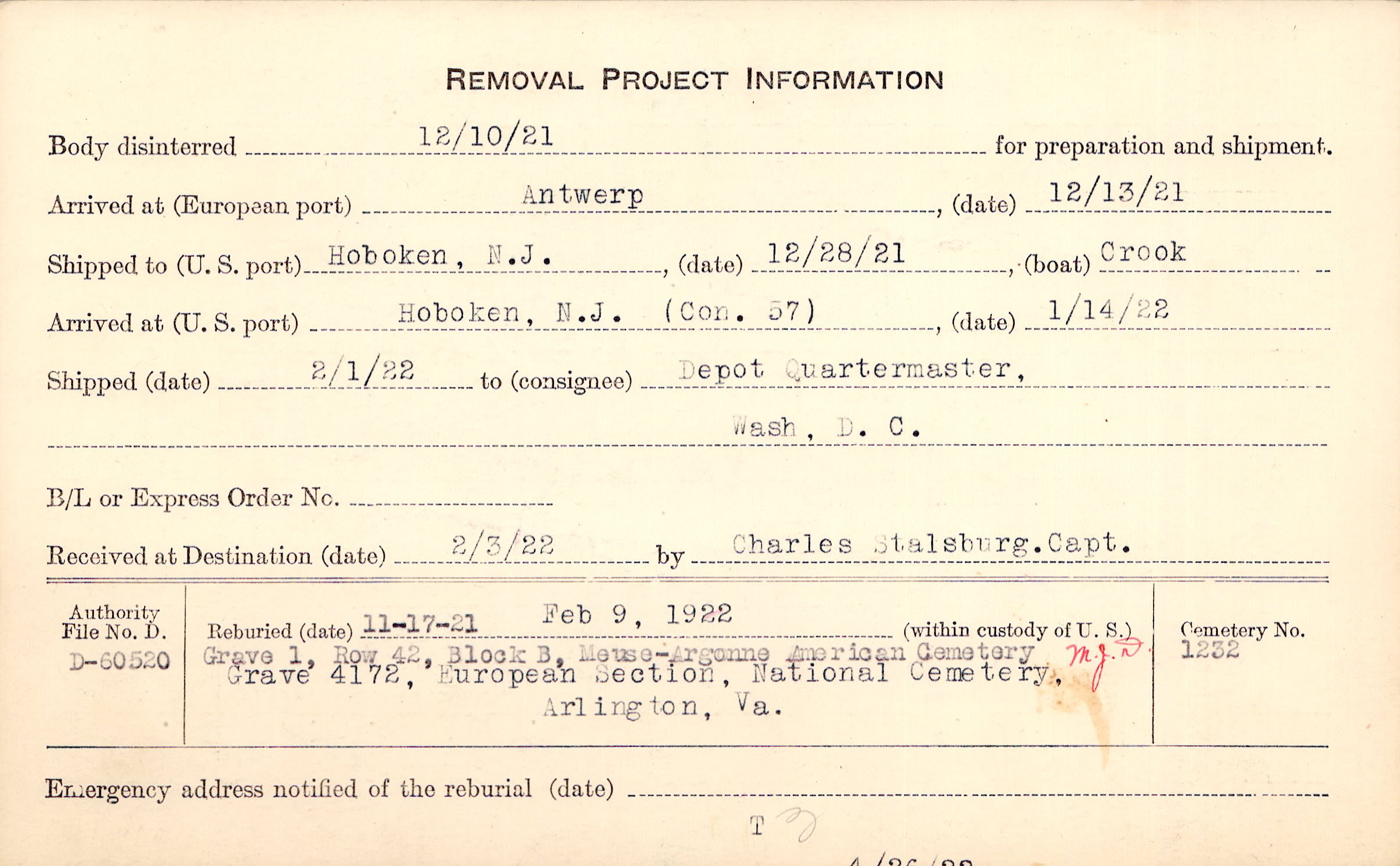 Body disinterred 12/10/1921 for preparation and shipment.