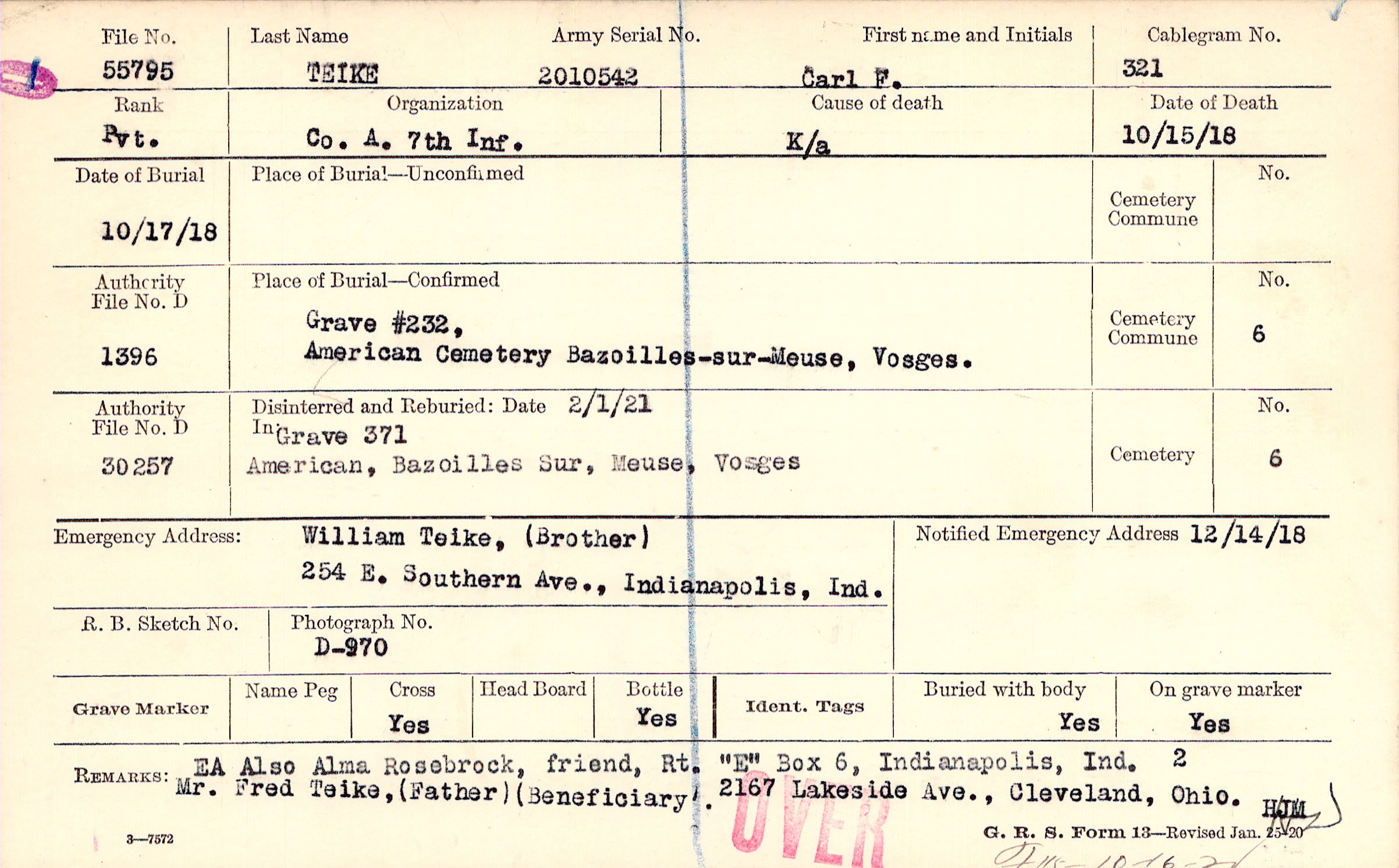 William Teike, (Brother), 254 E. Southern Ave. , Indianapolis, Ind., EA Also Alma Rosebrock, friend, Rt. "E" Box 6, Indianapolis, Ind. Mr Fred Teike, (Father) (Beneficiary) 2167 Lakeside Ave,m Cleveland, Ohio.