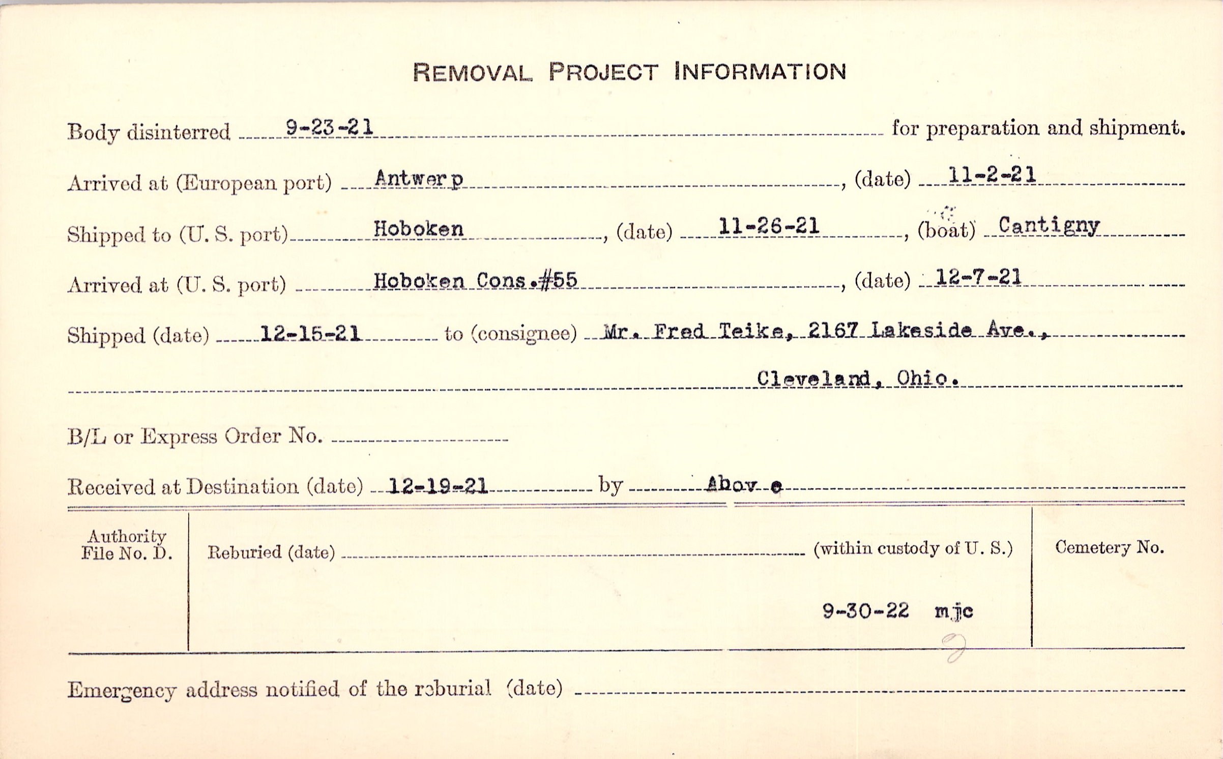 Body disinterred 9/23/1921 for preparation and shipment.