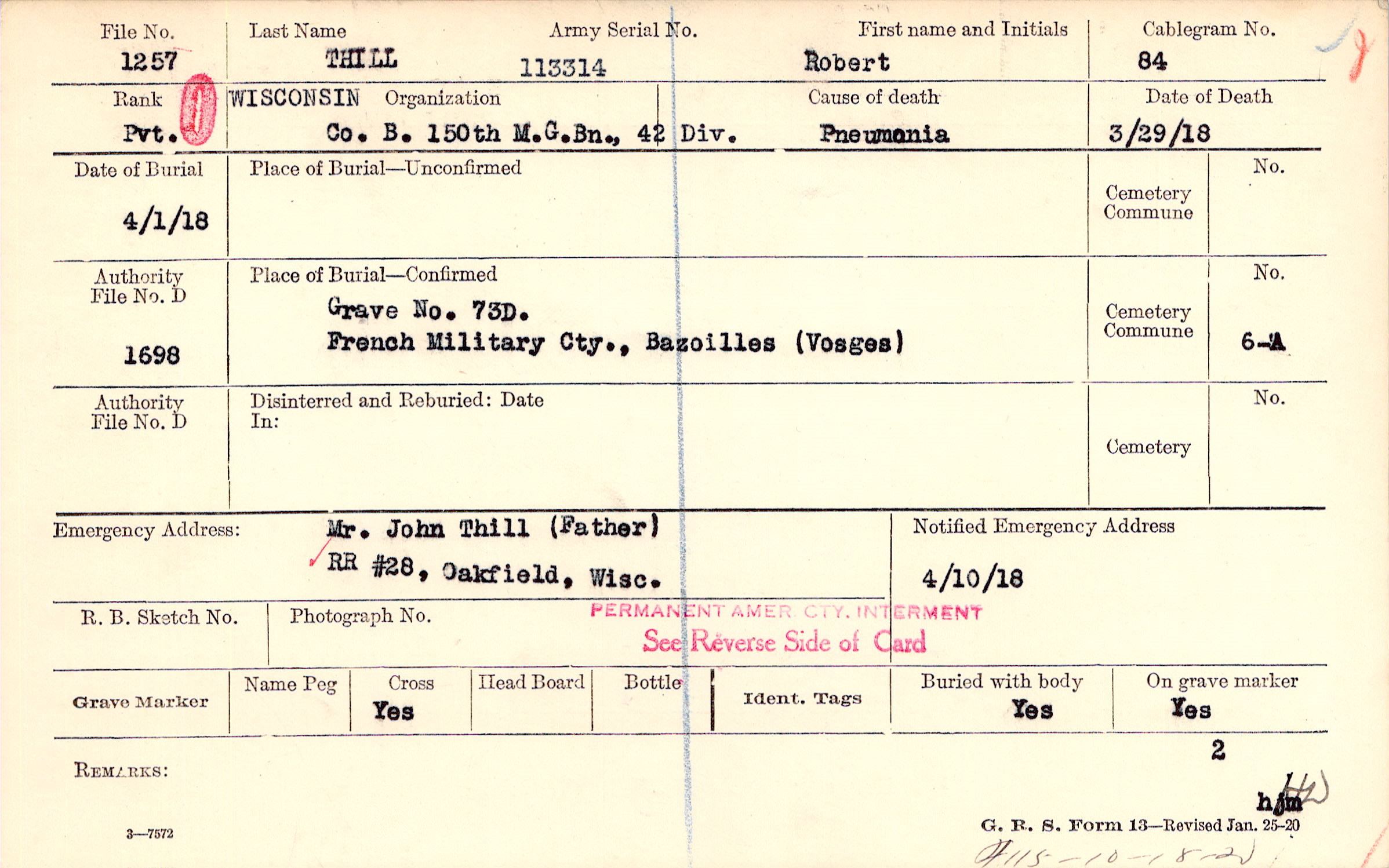 Grave 73D, French Military Cty., Bazoilles, Vosges