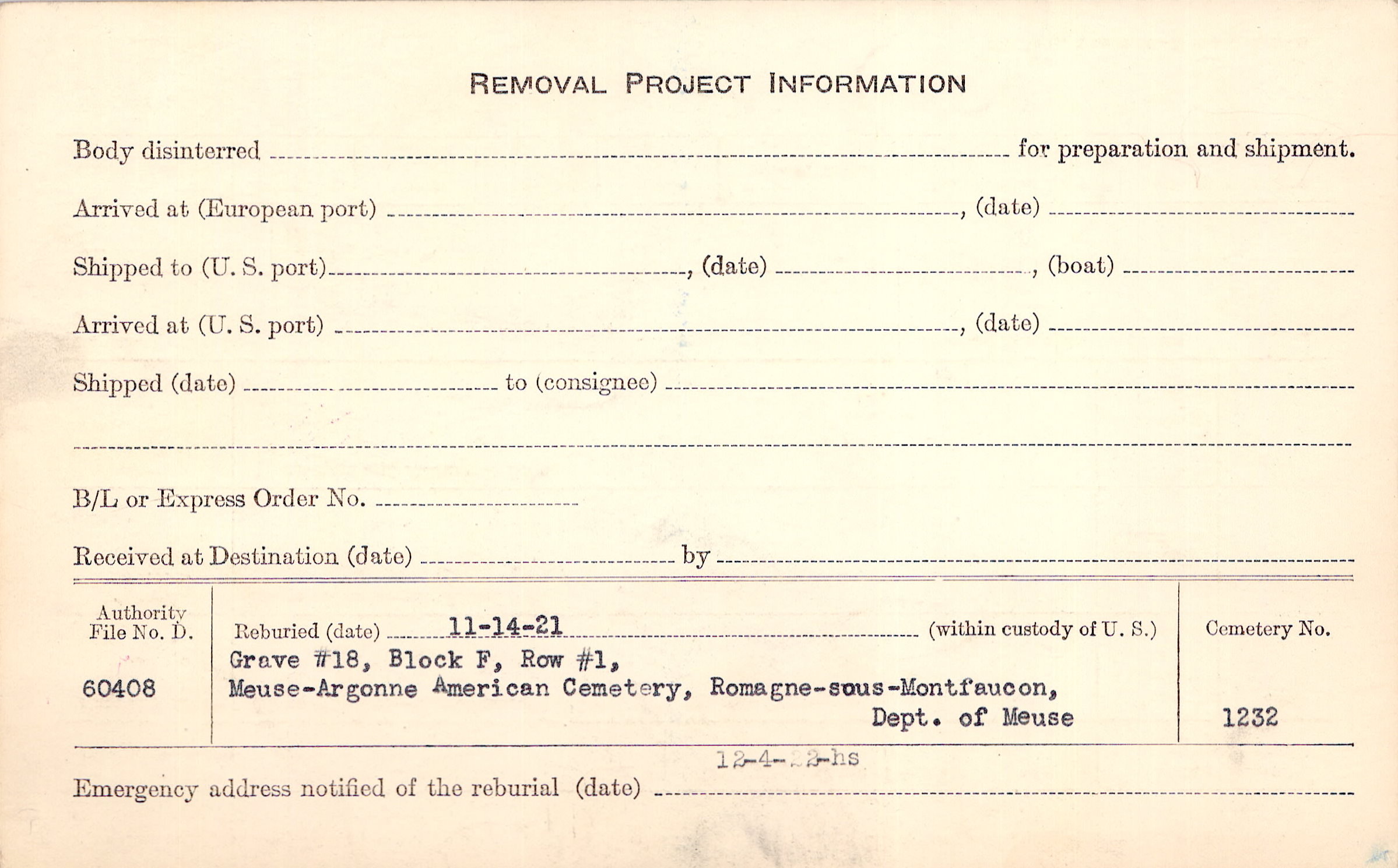 | Permanent Burial in Foreign Cemetery |