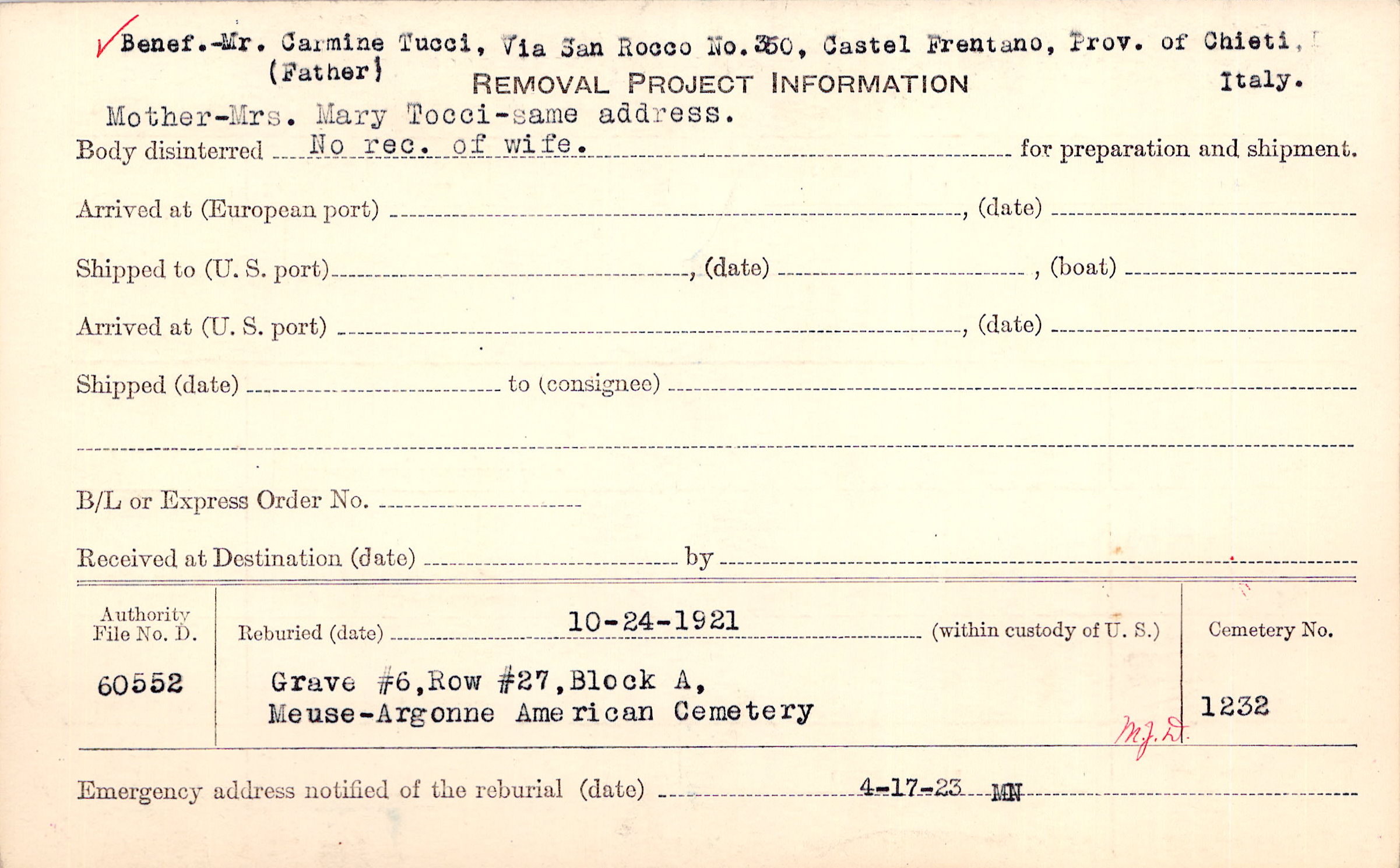 Benef - Mr Carmine Tucci, Via San Rocco No. 360, Castel Frentano, Prov. of Chieti, (Father) Mother - Mrs. Mary Tocci - same address. No rec. of wife. |