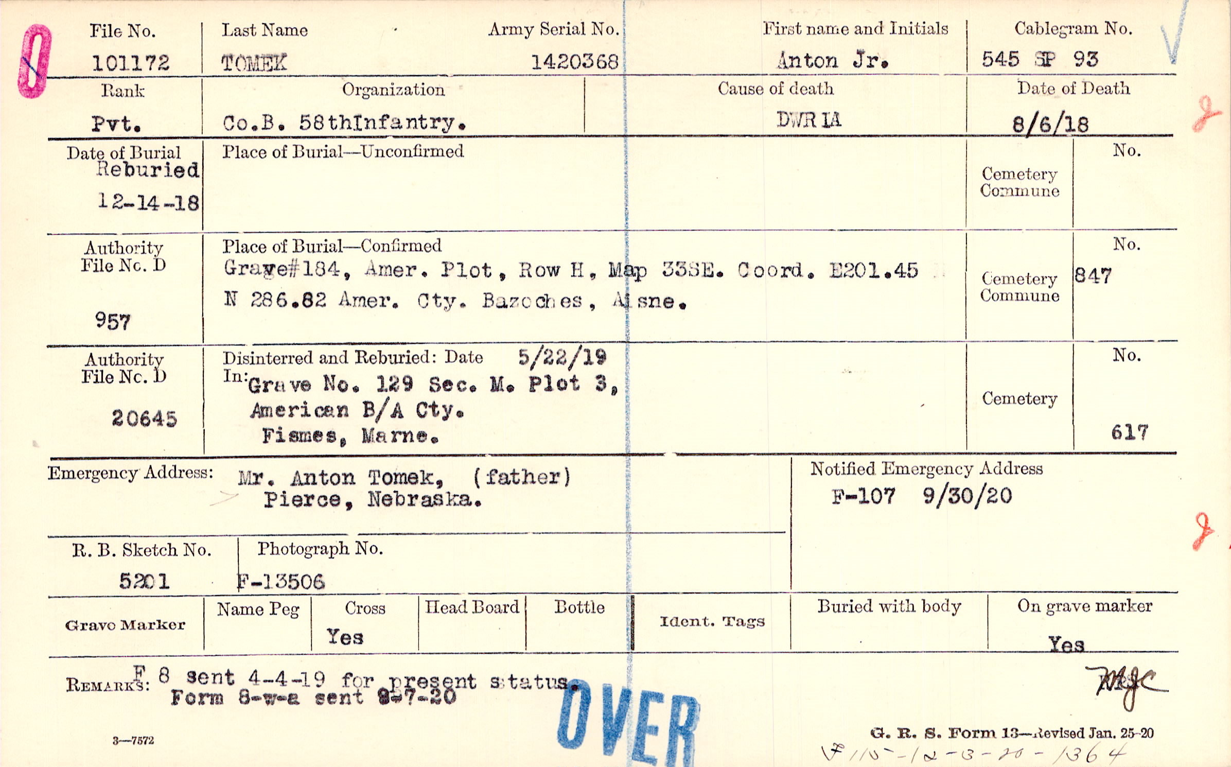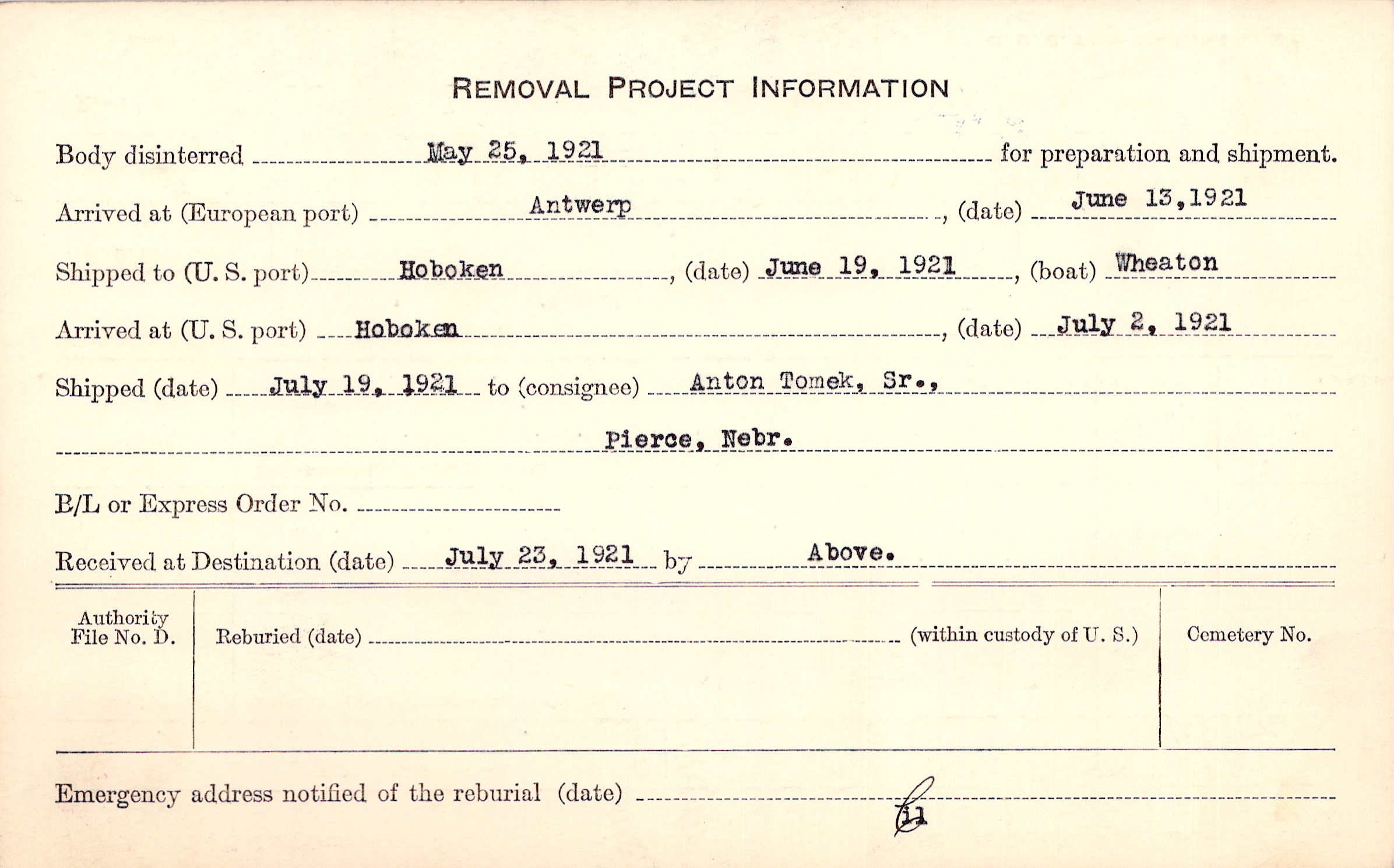 Mr. Anton Tomek, (father), Pierce, Nebraska.