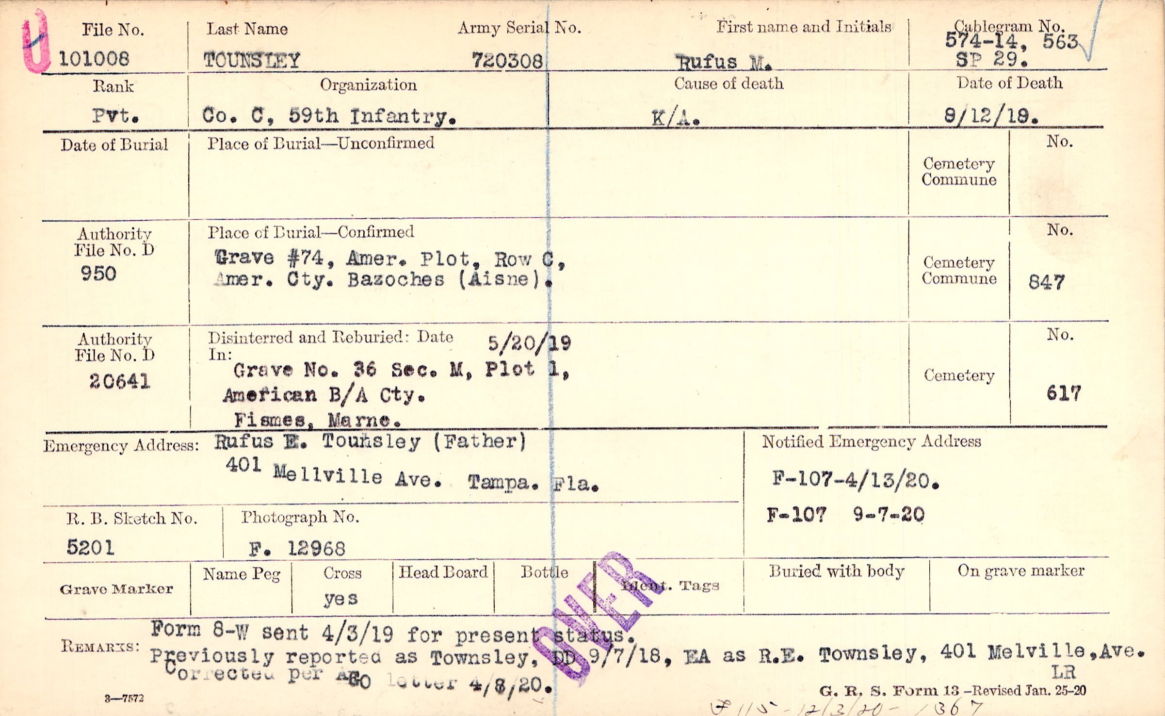 Rufus E. Tounsley (Father), 401 Mellville Ave. Tampa. Fla.