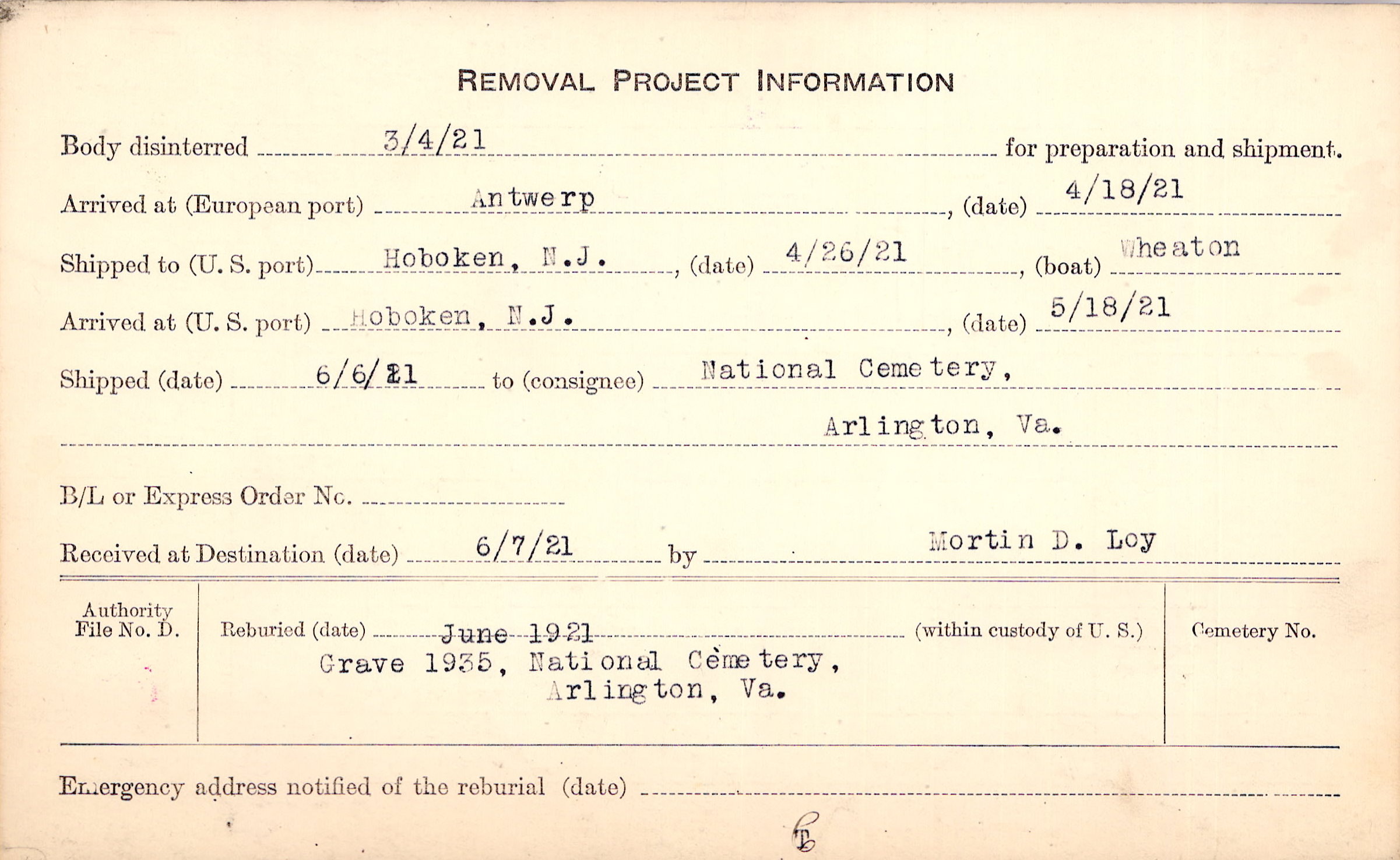 Body disinterred 3/4/1921 for preparation and shipment.