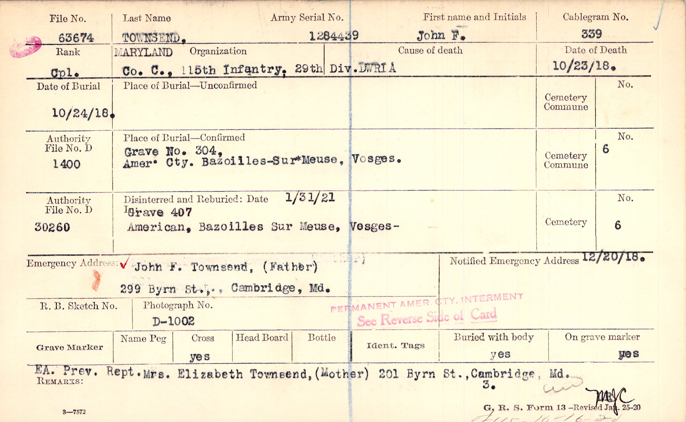 John F. Townsend, (Father), 299 Byrn St., Cambridge, Md.